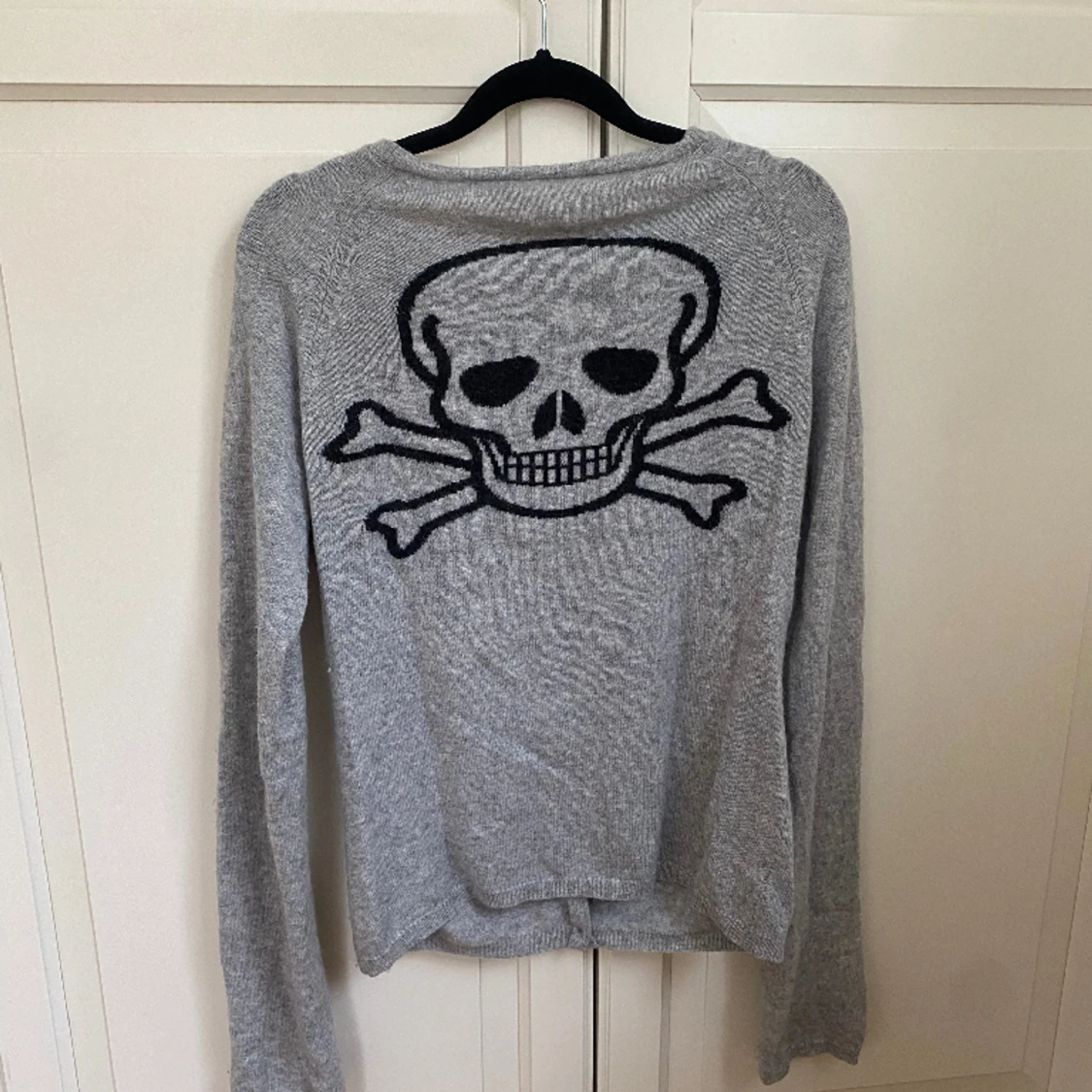 Kashmir kofta med dödskalle på ryggen, mycket bra skick endast använd ett fåtal gånger!💕 ingen storleksanvisning på tröjan men den passar S/M💖100% Kashmir!
