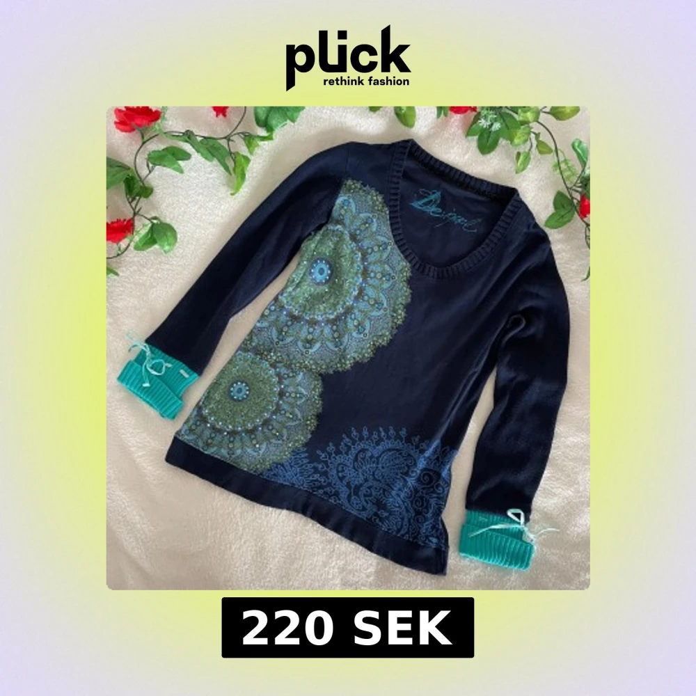 Säljer en unik mörkblå tröja från Desigual med grönt och blått mandalamönster framtill. Tröjan har långa ärmar med turkosa ribbade muddar och dekorativa band. Perfekt för dig som gillar färg och detaljer!