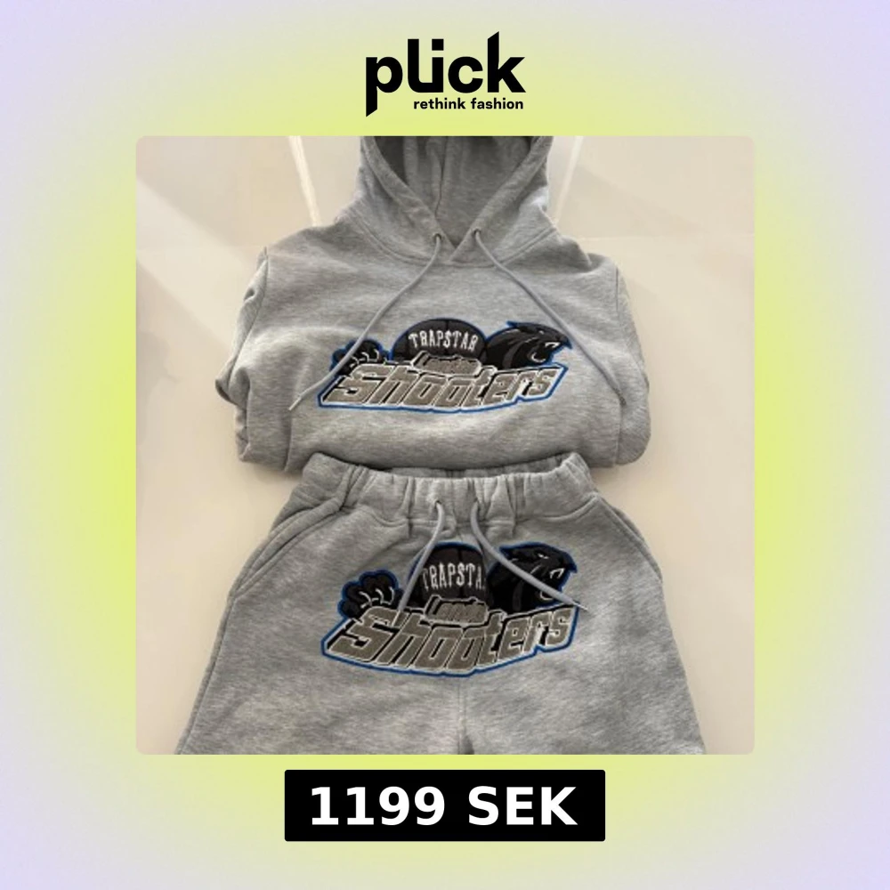 Säljer en grå set från Trapstar med ett coolt 'Shooters' tryck i svart och blått på framsidan. Settet har en klassisk passform med dragsko i huvan och ribbade muddar vid ärmslut och nederkant. Perfekt för en avslappnad stil.