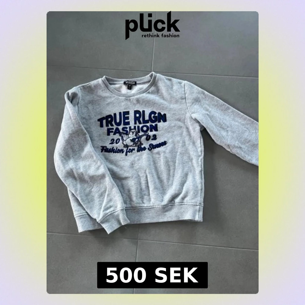 Asfet grå sweatshirt med blått och svart tryck från True Religion. Storlek S!! Skriv för frågor!!