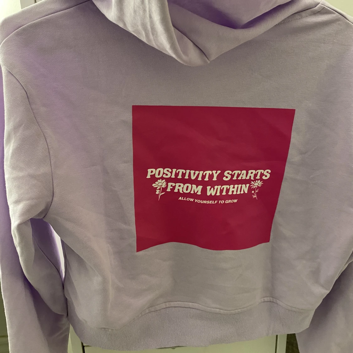 En lila ganska kort tröja med dragkedja, snörning & luva. Baktill har den ett rosa tryck med text på. Helt oanvänd och super fin. Skönt material. 40kr+frakt