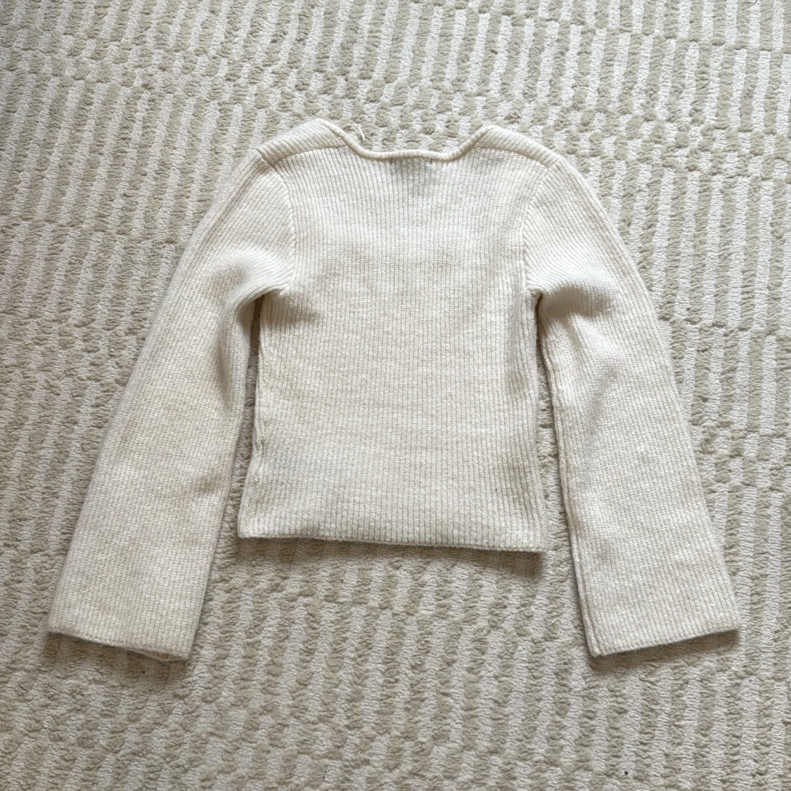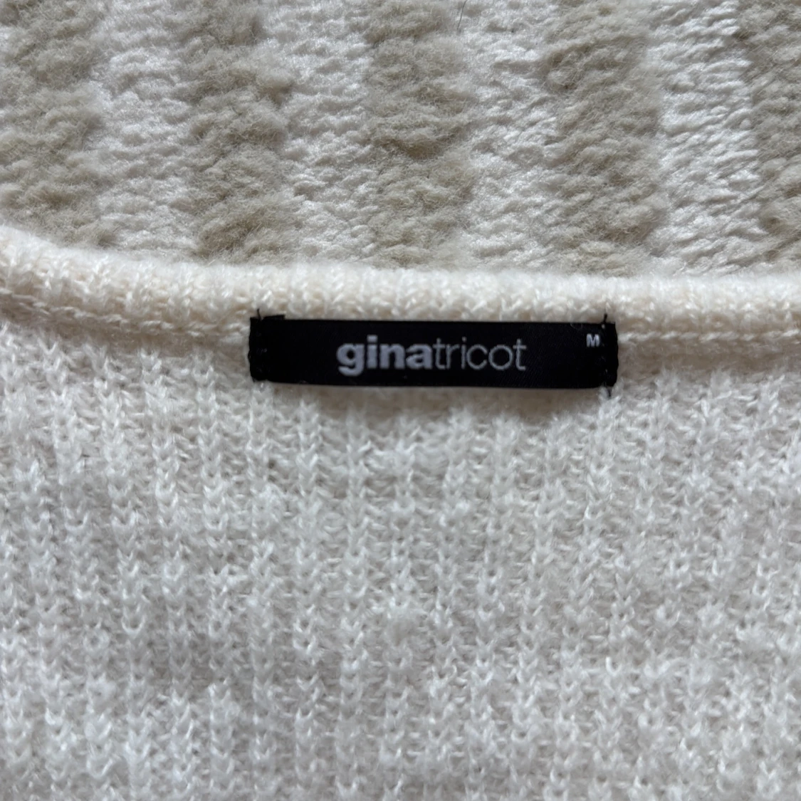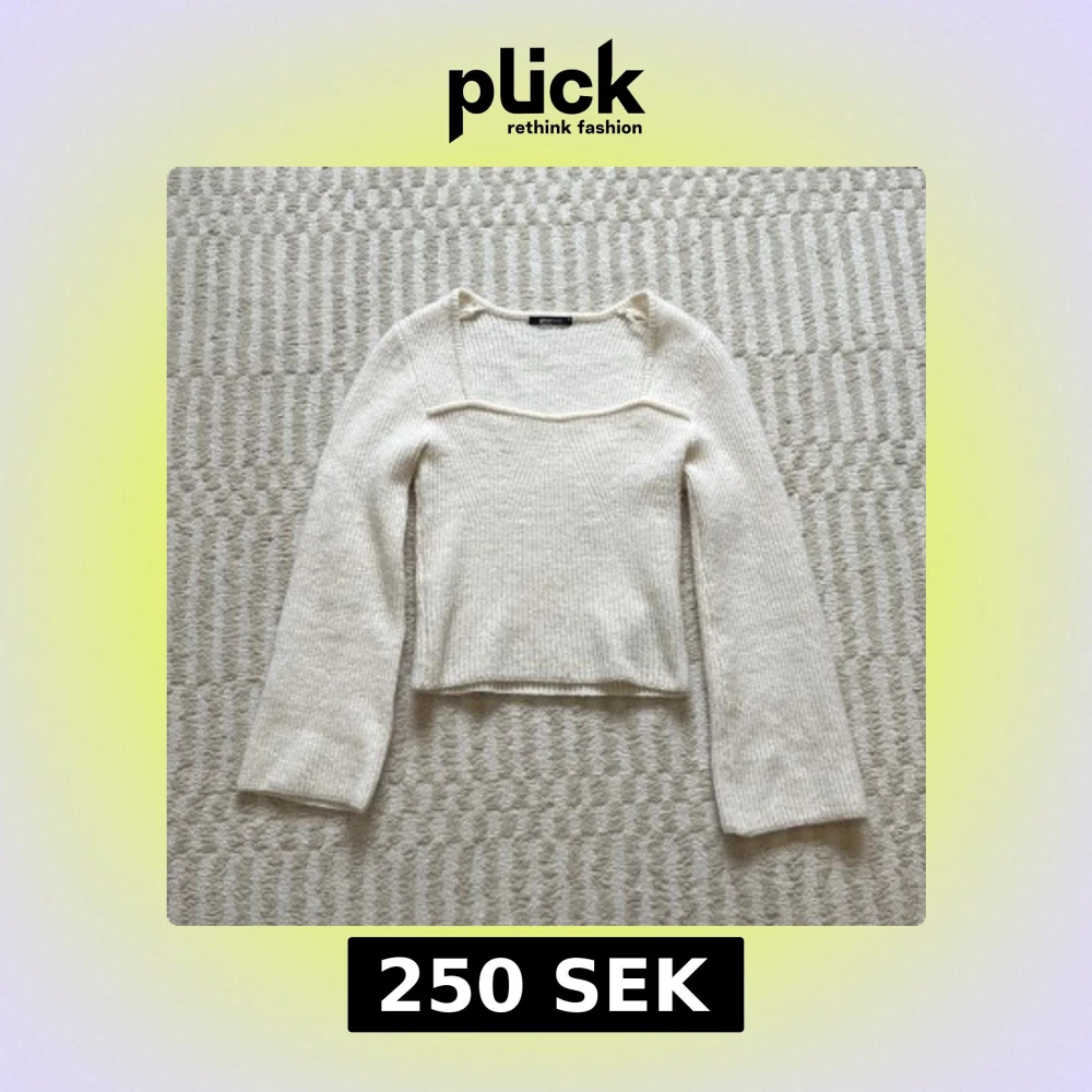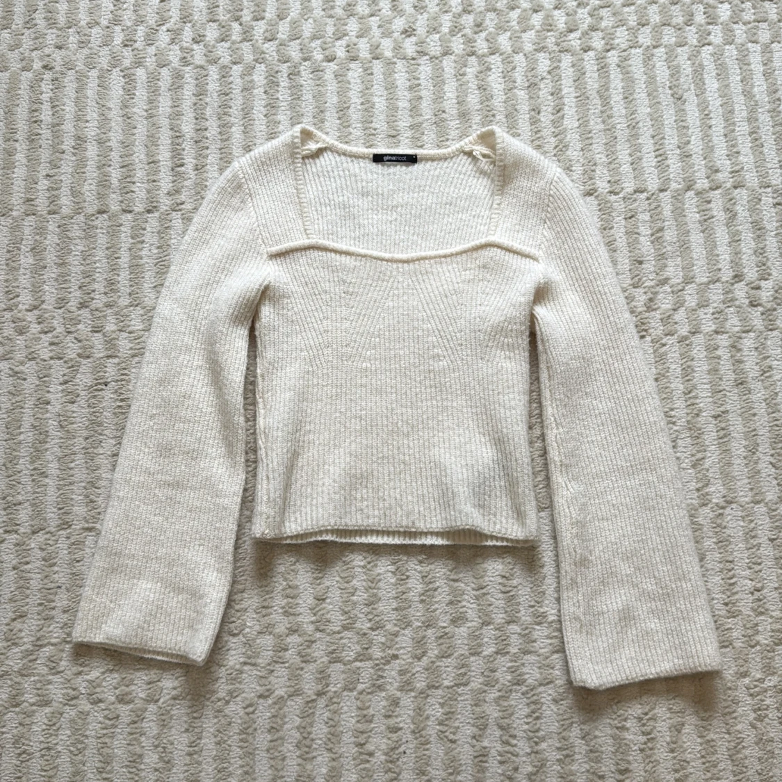 Superfin vit ribbstickad tröja från Gina Tricot med fyrkantig ringning och långa ärmar. Tröjan har en lätt croppad passform och är gjord i ett mjukt stickat material💓endast använd en gång!!