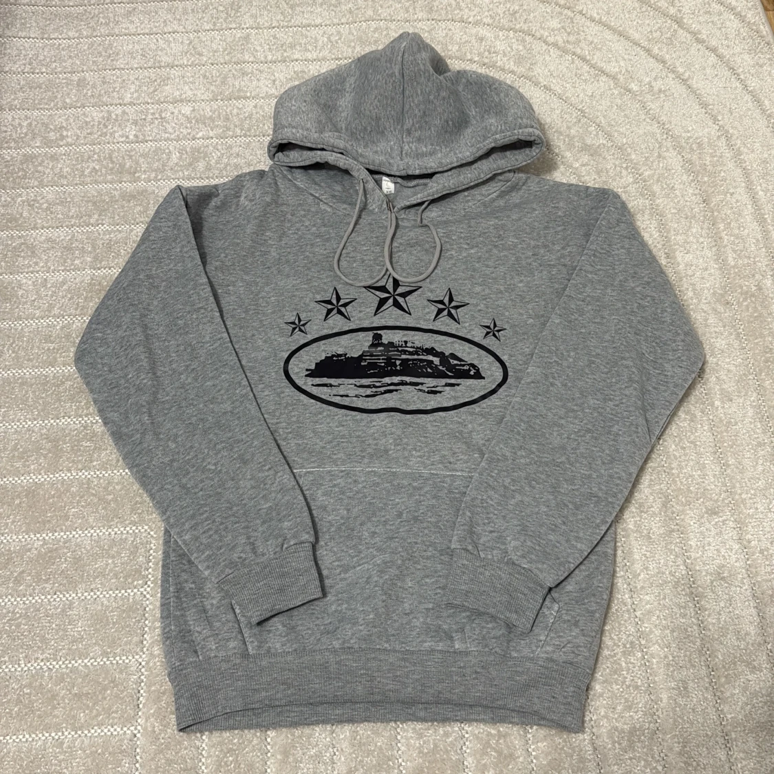 Helt ny grå hoodie från Corteiz 5 Stars Alcatraz-serien. Storlek XS. Mjuk och bekväm med bomull på insidan för extra komfort. Aldrig använd, inga defekter eller märken. Perfekt för dig som vill ha en stilren och exklusiv hoodie.
