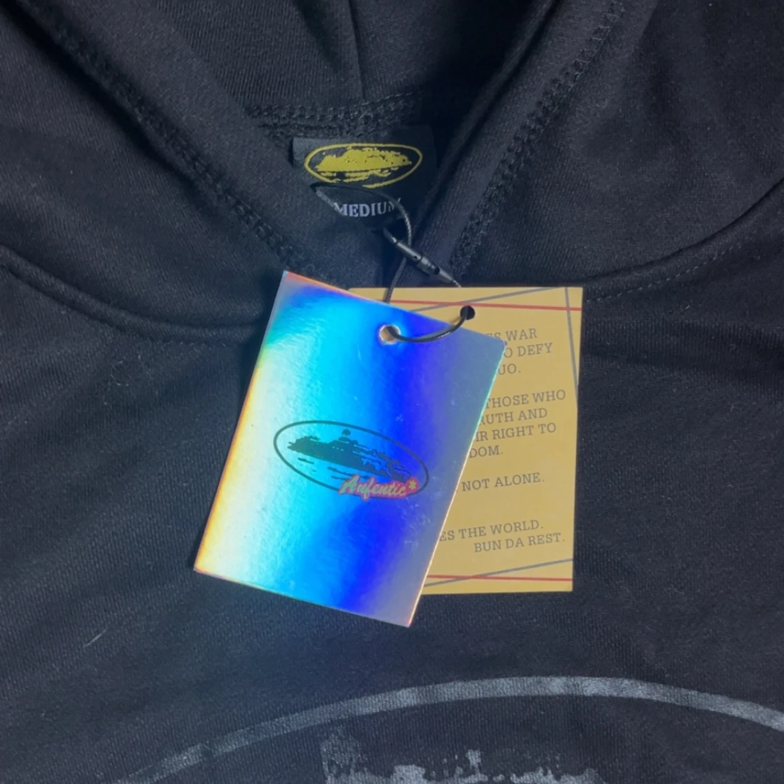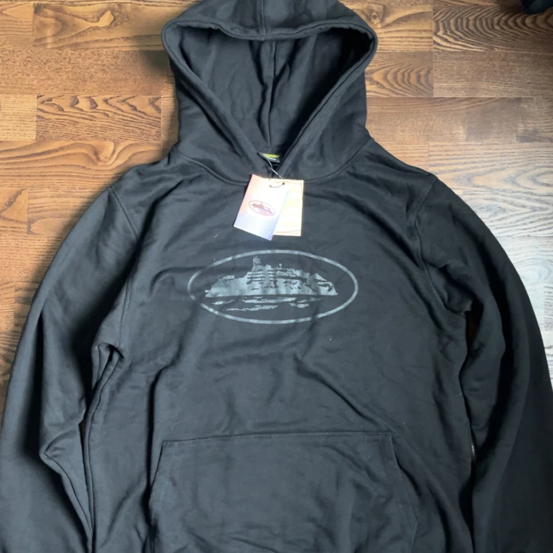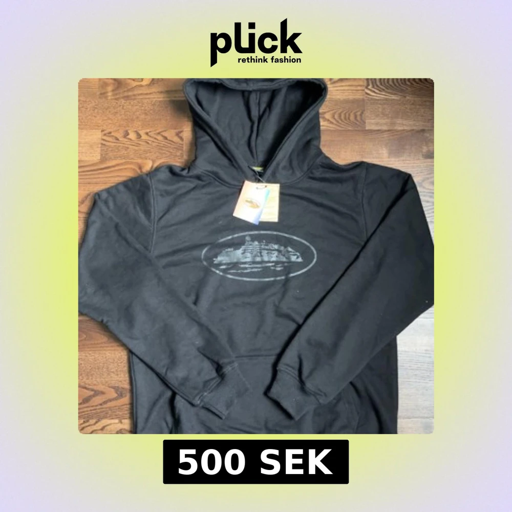 Svart hoodie med ett coolt tryck av en byggnad i grått på bröstet. Klassisk huva, känguruficka och ribbade muddar. Perfekt för dig som gillar streetwear och vill ha en stilren look.
