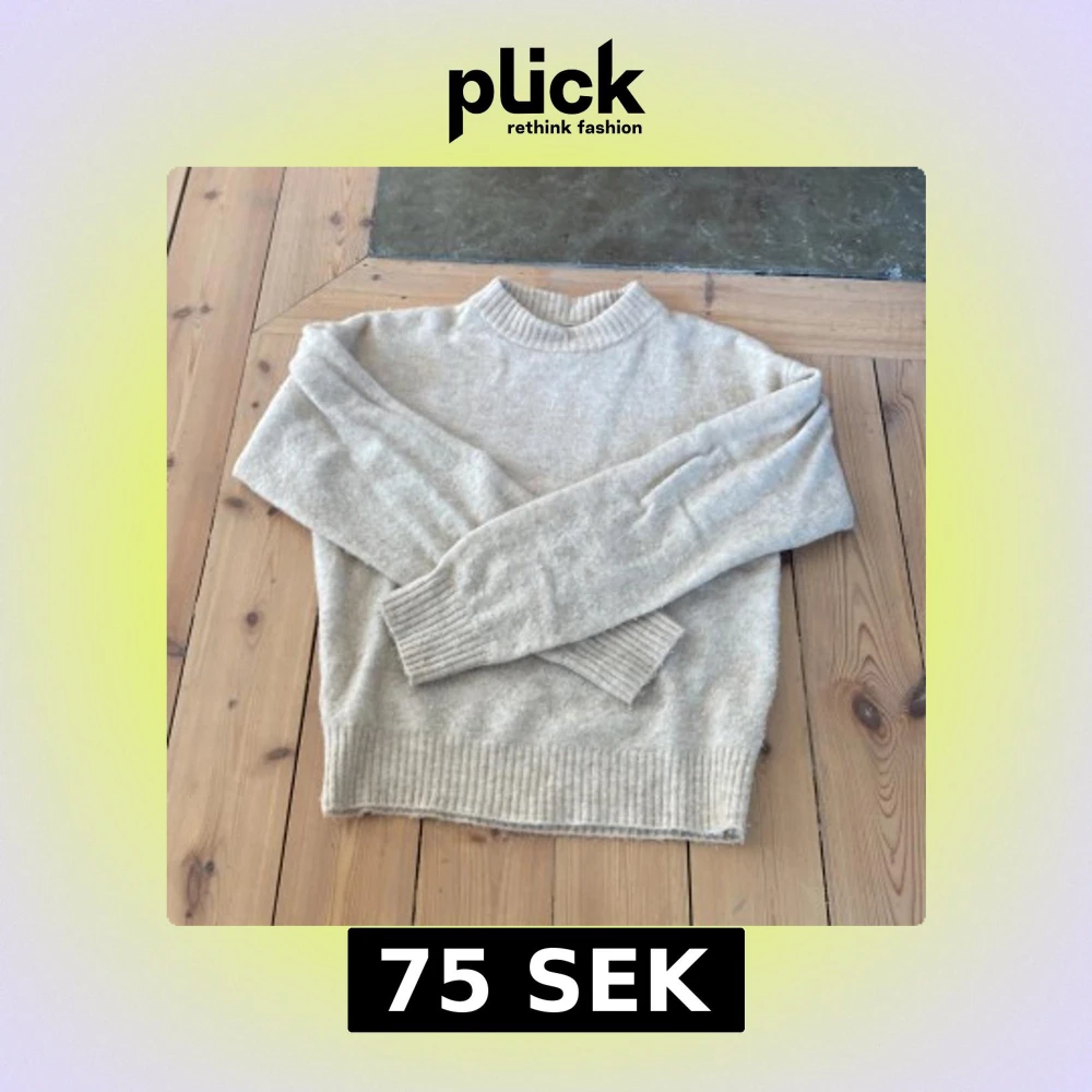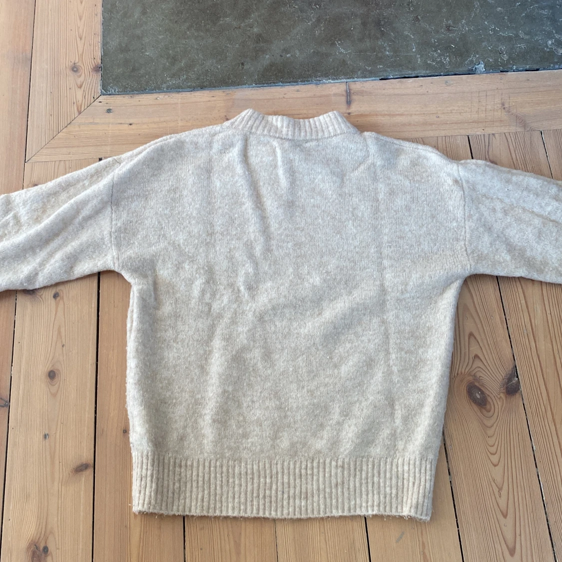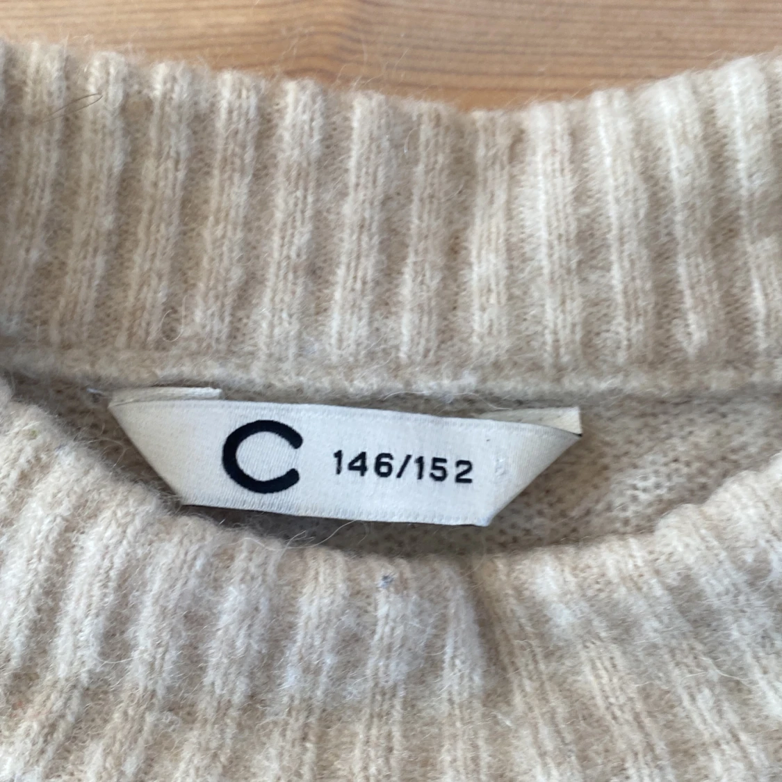 Mysig beige stickad tröja från Cos i storlek 146/152. Tröjan har en ribbad hög krage och ribbade muddar vid ärmslut och nederkant. Perfekt för kyliga dagar och enkel att matcha med jeans eller mjukisbyxor. Lite nopprig på framsidan.