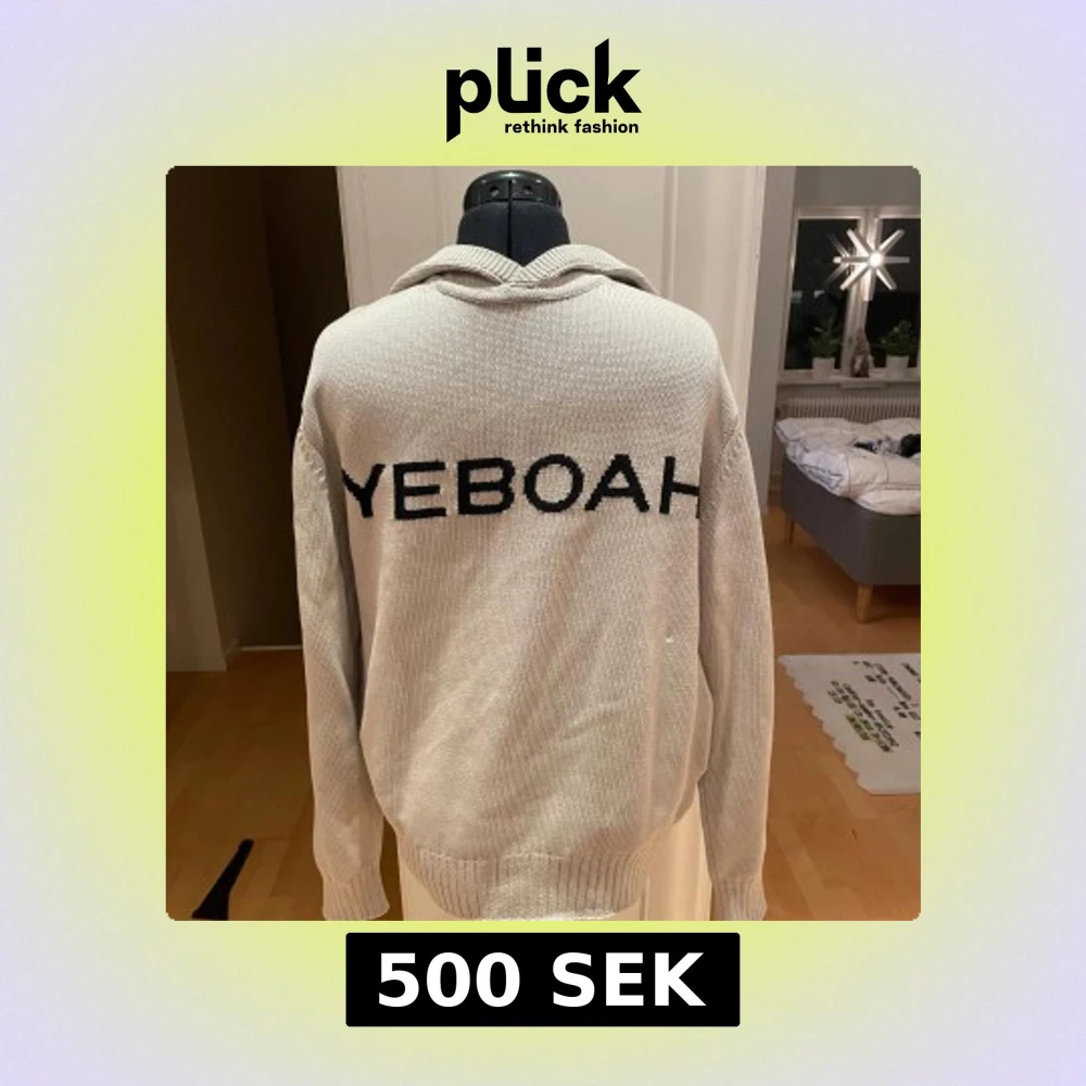 Snygg beige stickad hoodie med texten 'YEBOAH' i svart på framsidan och en svart stjärna på ryggen. Perfekt för en avslappnad stil med en unik touch.