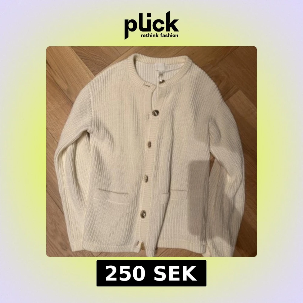 Säljer en stilren vit stickad kofta från H&M med rund hals och snygga silverfärgade knappar framtill. Koftan har två praktiska fickor och ribbad struktur som ger en cool och modern vibe. Perfekt att slänga på sig när det är lite kyligt ute.
