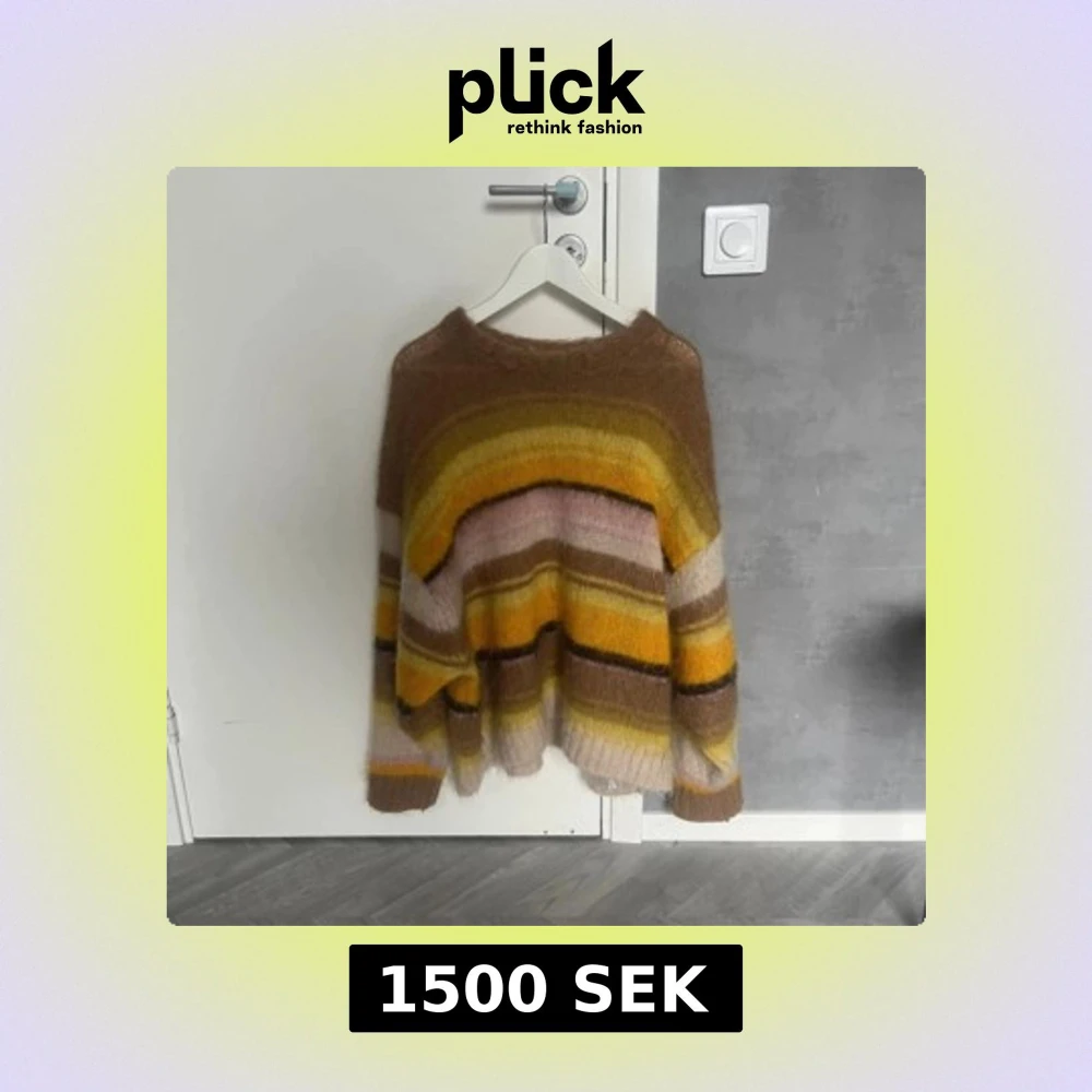 Supermjuk och oversized stickad tröja från COS i storlek L. Tröjan har breda ränder i brunt, gult, beige och rosa och är gjord i mohair- och ullmix.