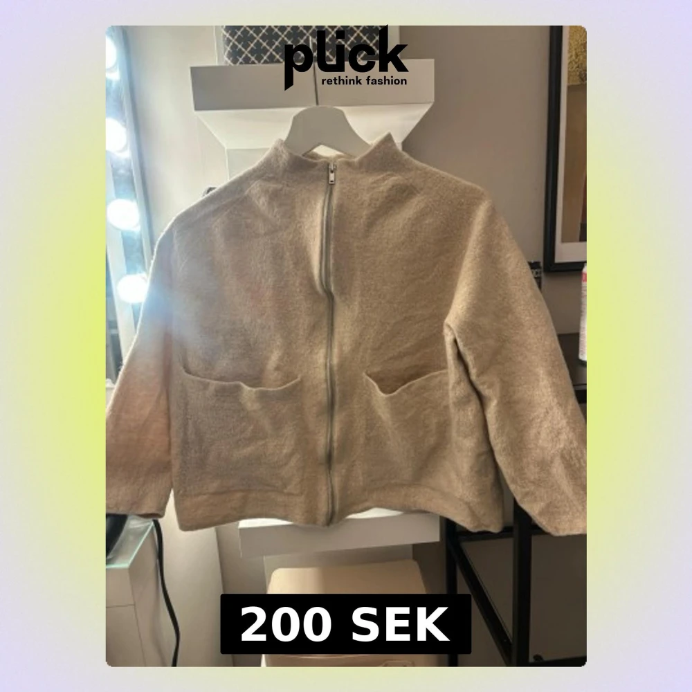 Säljer en beige ziptröja från COS med hög krage och två stora fickor framtill. Tröjan har en boxig passform och är gjord i ett mjukt, ull-liknande material. Perfekt för lager på lager och enkel att styla till olika outfits. Kort i armarna och själva tröjan är kort. Inte använt mycket, 3 ggr
