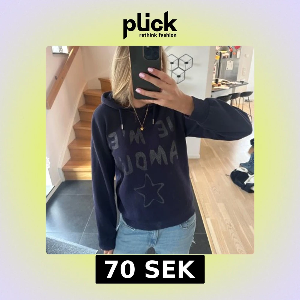 Säljer en mörkblå hoodie från Gina young . Framsidan har glittrig text och en stjärna i silver. Perfekt för dig som gillar en chill och snygg stil! Storleken är 146/152 men den passar mig som normalt sätt har XS/S