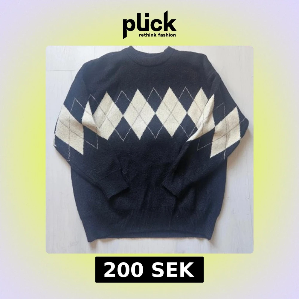 Svart stickad tröja med klassiskt argylemönster i vitt och beige över bröstet och ärmarna. Tröjan har rund halsringning och långa ärmar, perfekt för dig som gillar preppy vibes och vill sticka ut lite extra.
