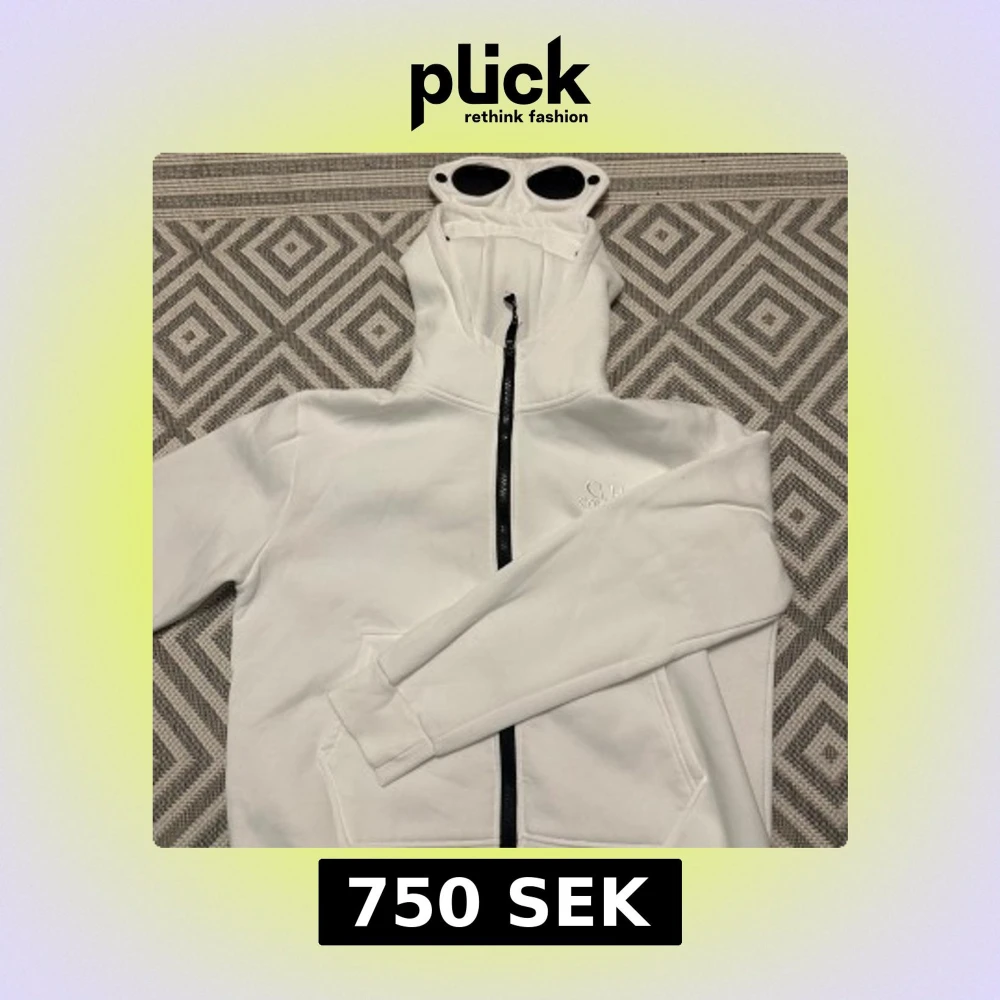 Säljer en vit hoodie från C.P. Company med ikoniska goggles i huvan. Tröjan har hel dragkedja framtill, fickor och broderad logga på bröstet. Perfekt för dig som vill sticka ut med streetwear-vibe och coola detaljer.