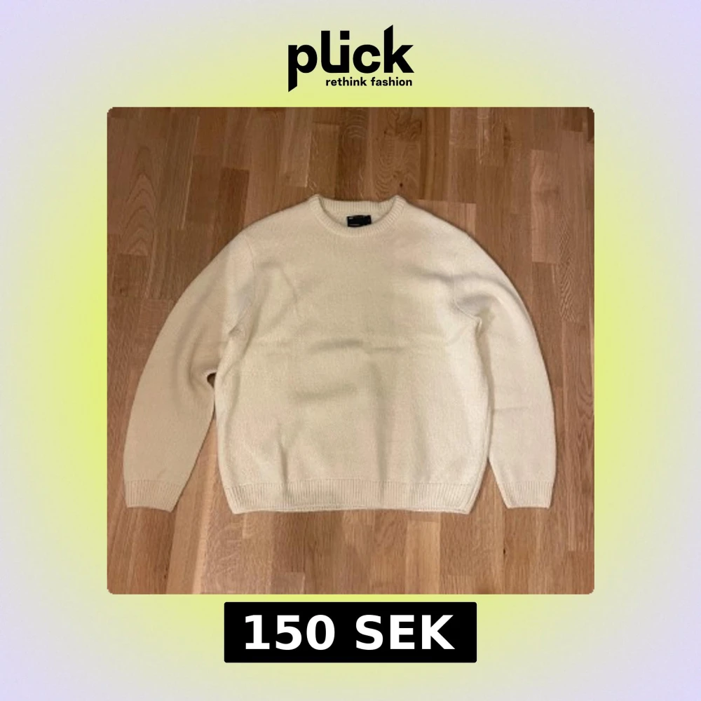 Säljer en enkel och stilren vit stickad tröja med rund halsringning. Tröjan har långa ärmar och ribbade muddar vid ärmslut och nederkant. Oversized