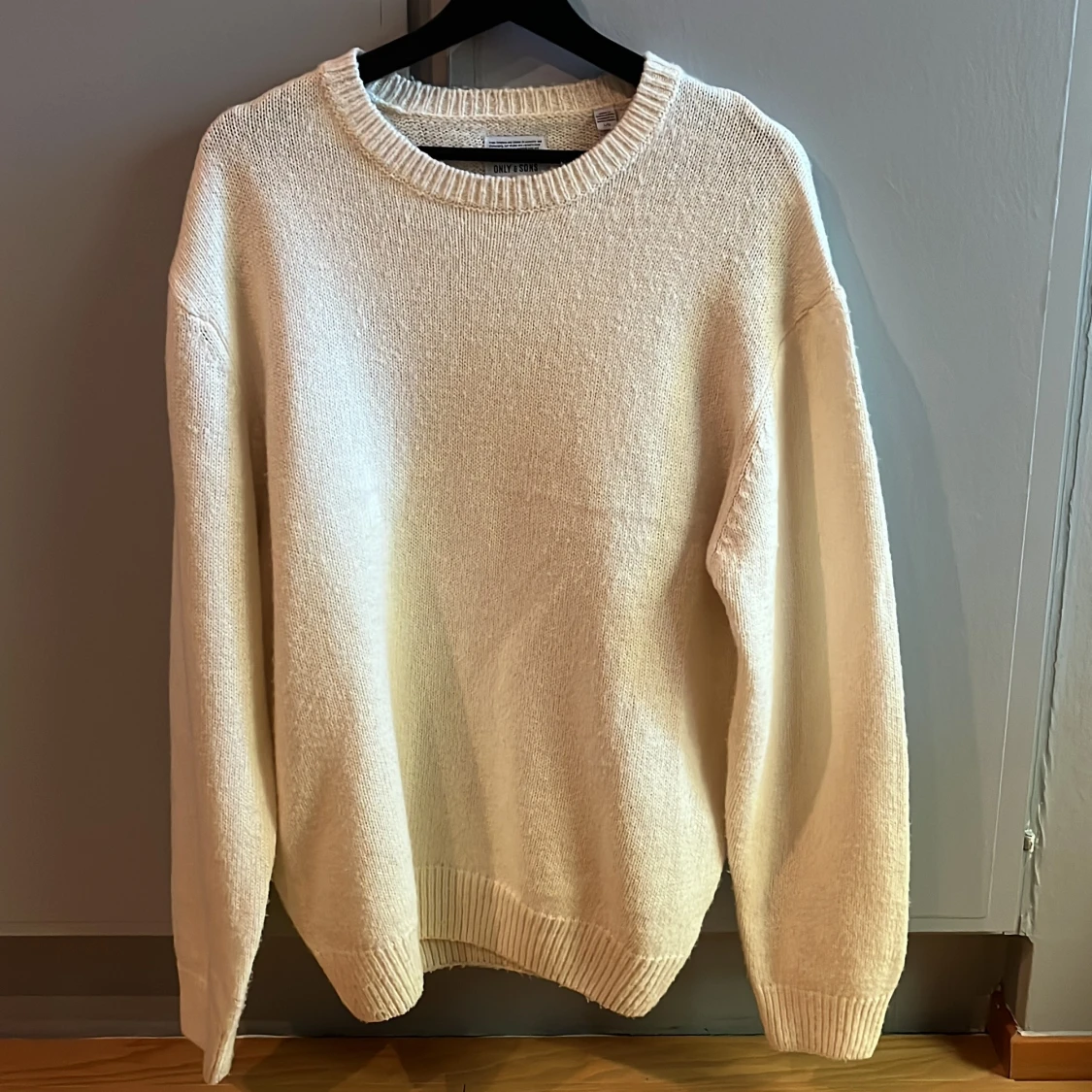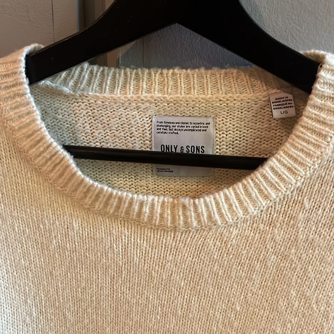 Säljer en stilren vit/beige stickad tröja från Only & Sons i storlek L men kan passa M. Tröjan har rund halsringning, ribbade muddar och är långärmad. Enkel och clean design som funkar året runt.