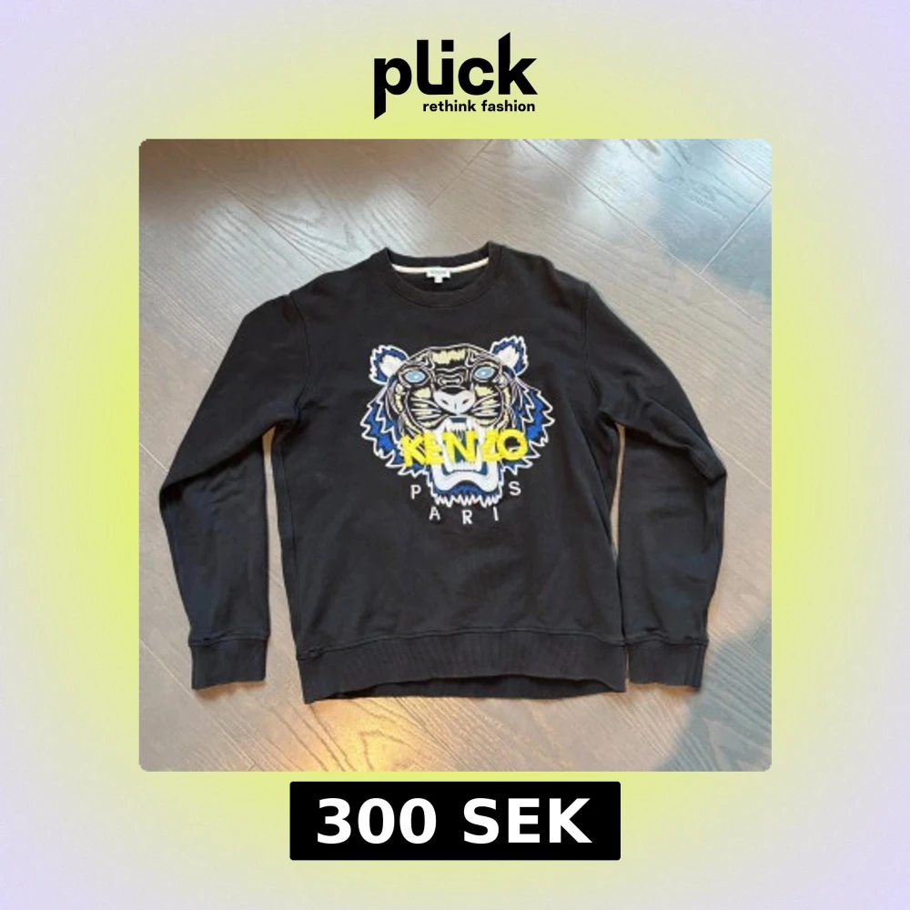 Svart sweatshirt från Kenzo med ikoniskt broderat tigerhuvud i blått, vitt och gult framtill. Tröjan har rund hals, ribbade muddar och är långärmad. Perfekt statement-plagg för dig som vill sticka ut med en cool streetstyle-look. Några Småhål men inget som syns vid användning