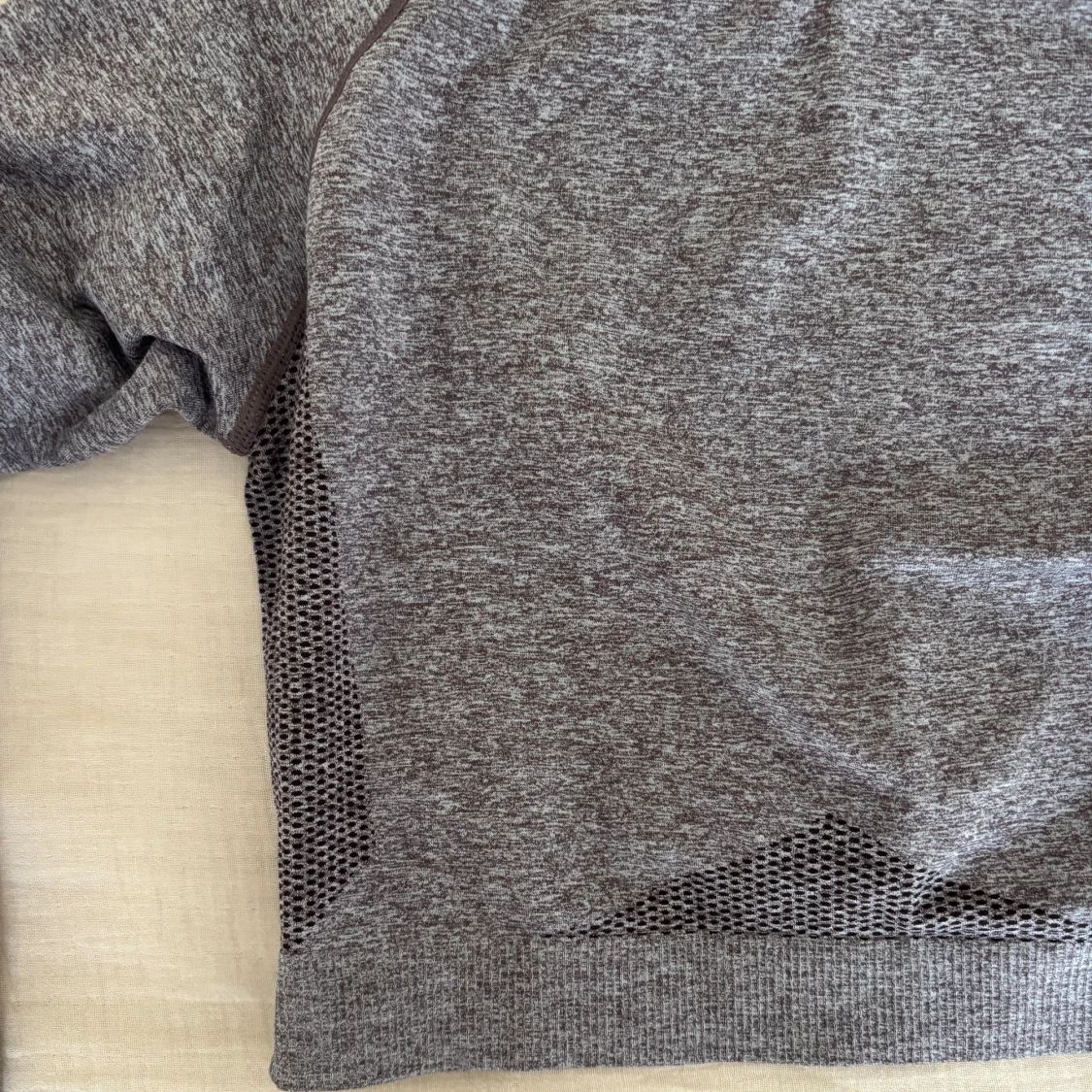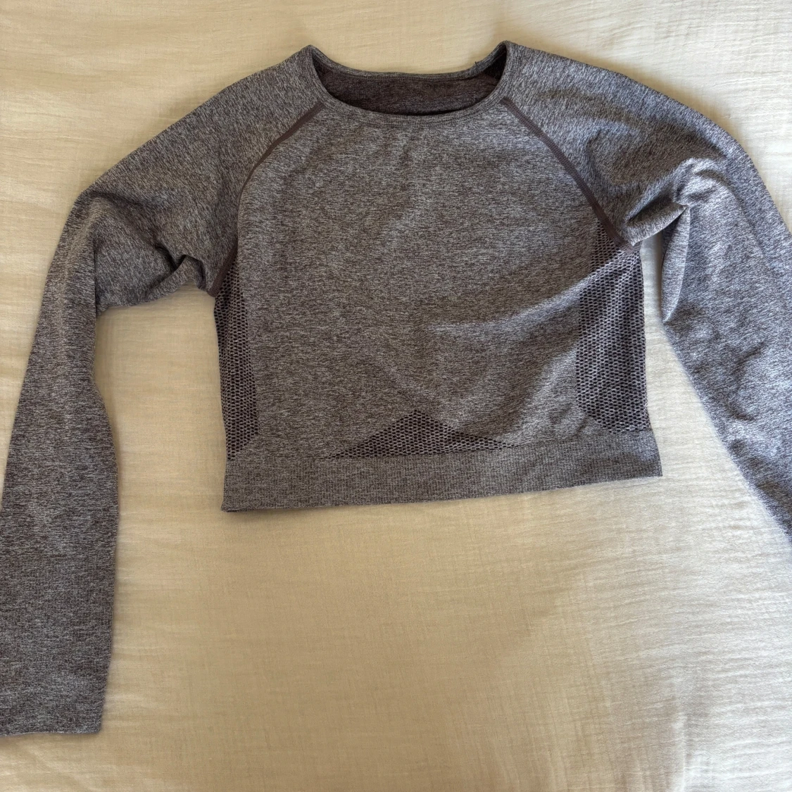 Snygg gråmelerad croppad långärmad träningströja från Relode. Tröjan har mesh-detaljer i sidorna för extra ventilation och tumhål i ärmsluten. Perfekt för gymmet eller löprundan, med tight passform och stretchigt material.