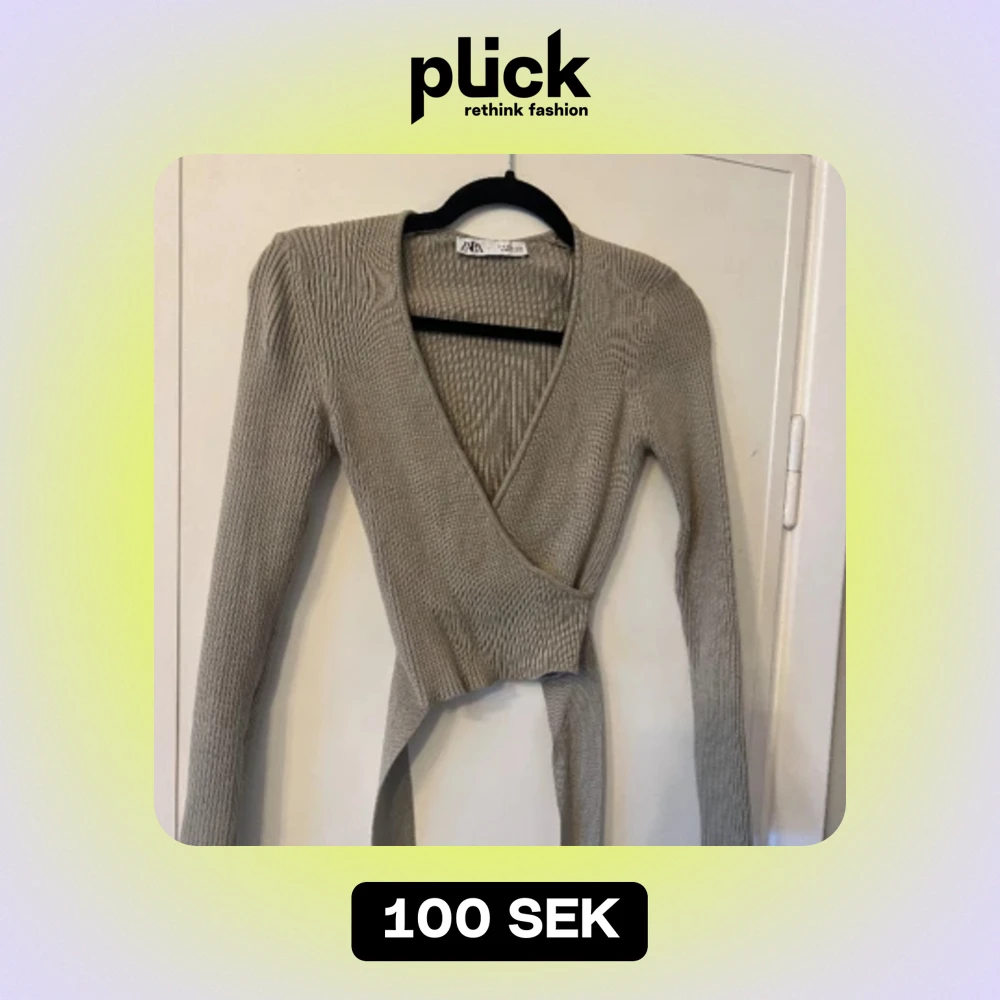 En khakifärgad fint stickad tröja från Zara. Tröjan är croppad och knyts runt midjan. I storlek S. Har använd ganska många gånger men är i fint skick!