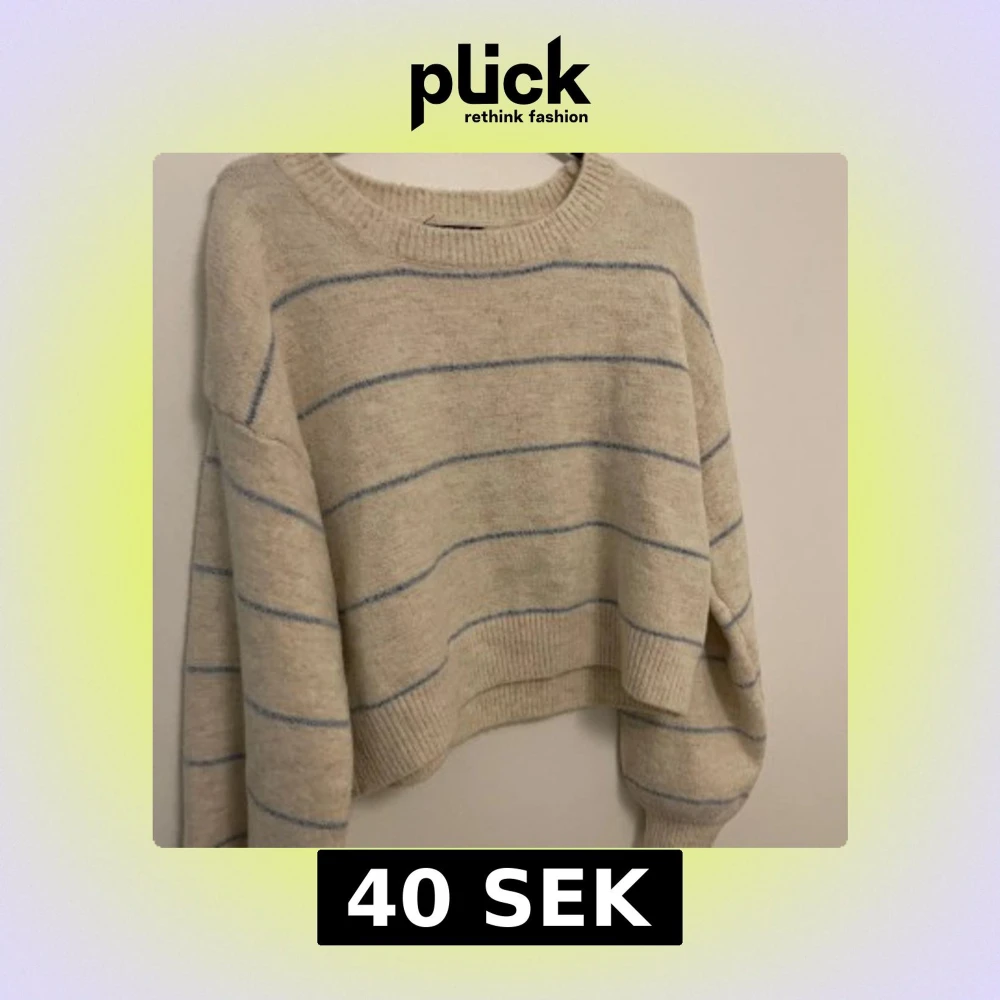 Säljer en mysig beige tröja från SHEIN med blå ränder. Tröjan har en croppad passform och långa ärmar, perfekt för en avslappnad stil. Mjuk o skön