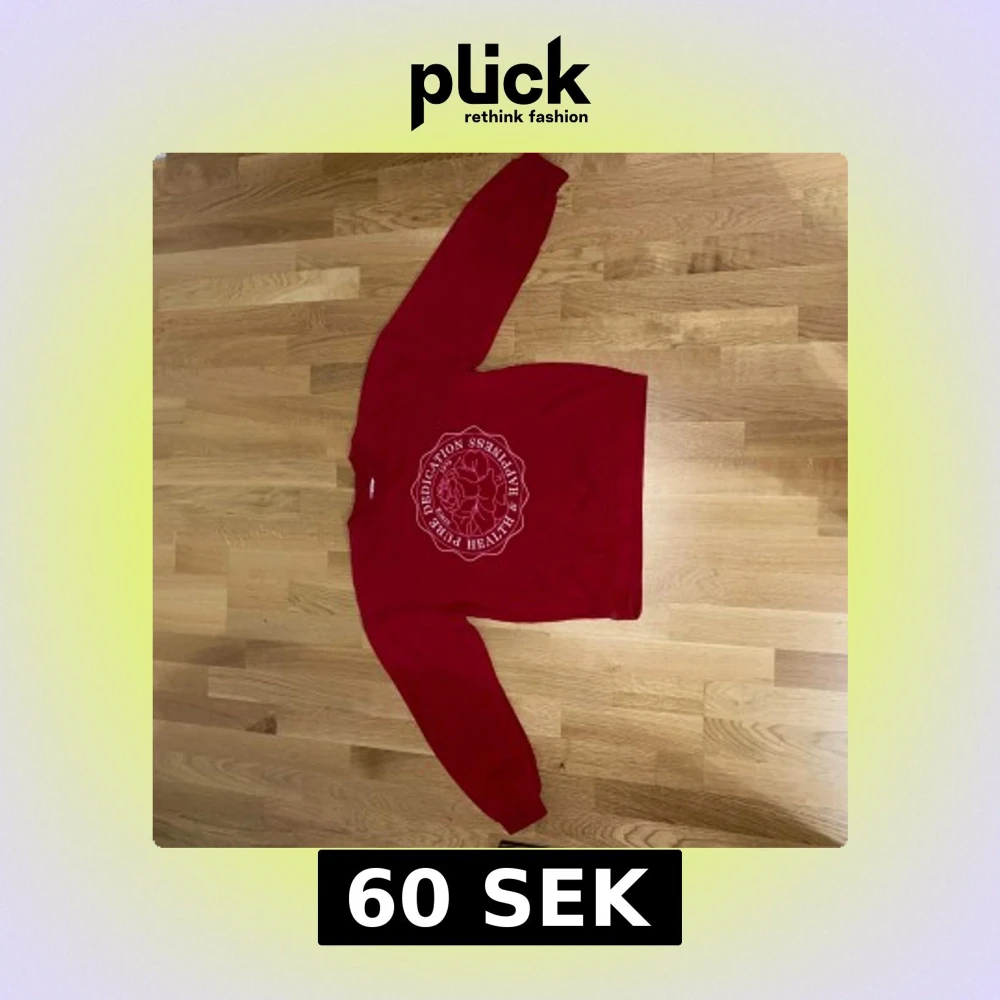 Röd sweatshirt med vitt tryck på bröstet där det står 'HEALTH PURE DEDICATION HAPPINESS'. Tröjan har rund hals och långa ärmar. Perfekt för en avslappnad stil.