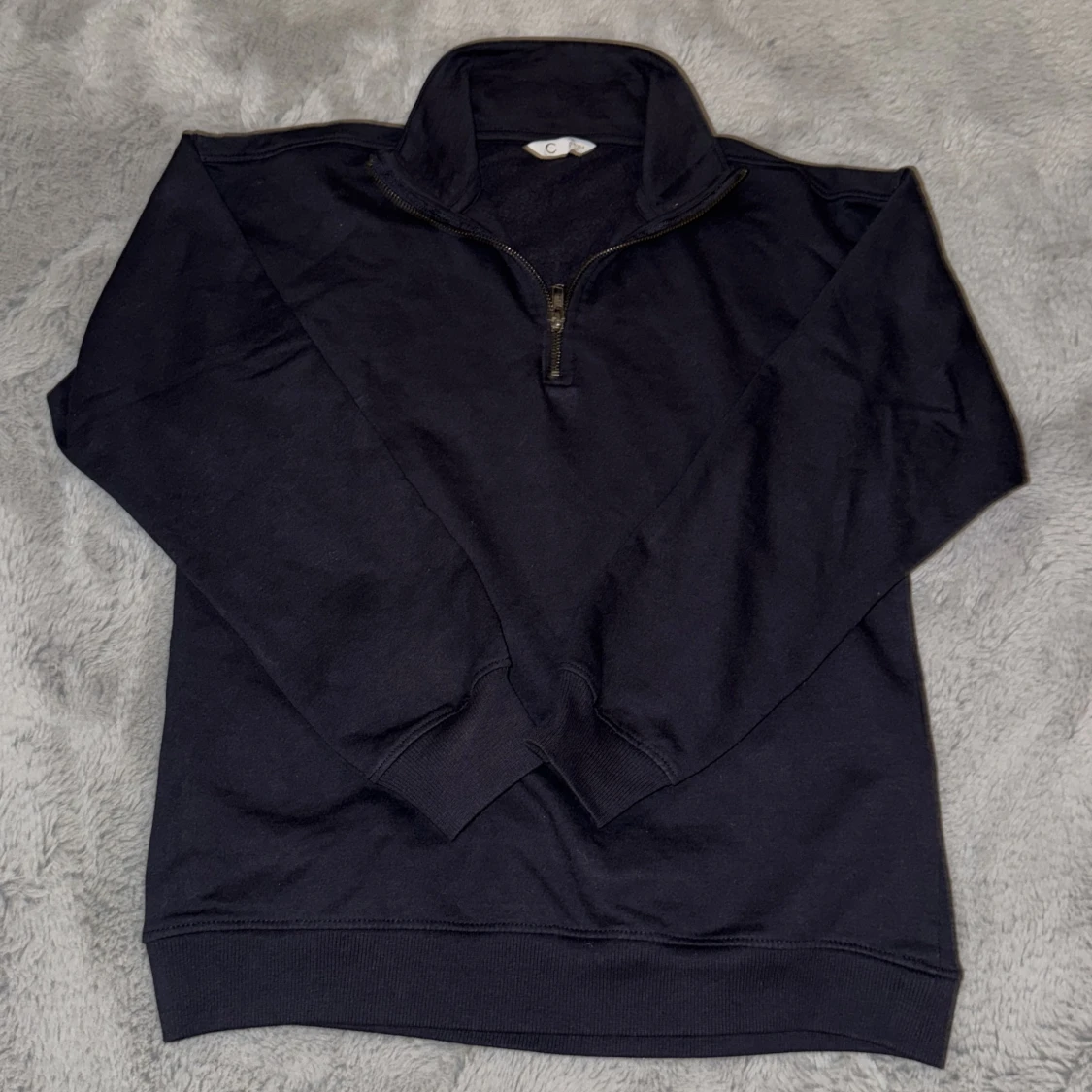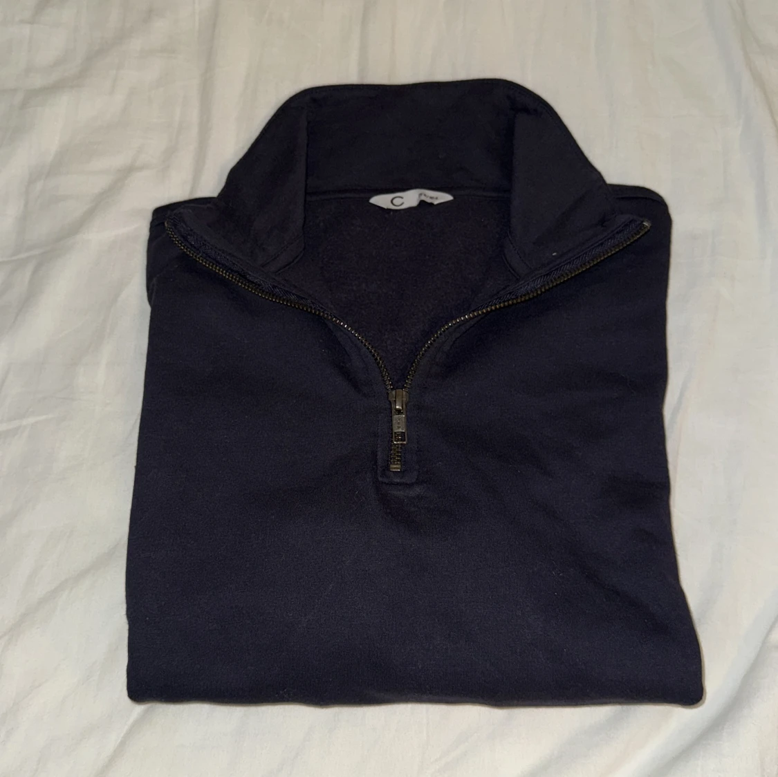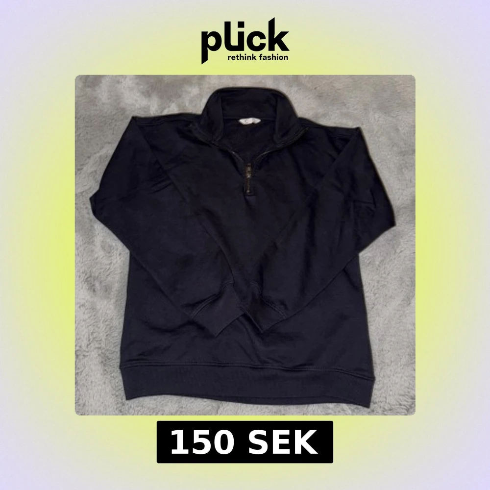 Mörkblå sweatshirt med half zip och hög krage. Tröjan har långa ärmar och ribbade muddar vid ärmslut och nederkant. Perfekt för lager-på-lager och chill dagar. Materialet känns mjukt och skönt, troligtvis bomull eller bomullsblandning.