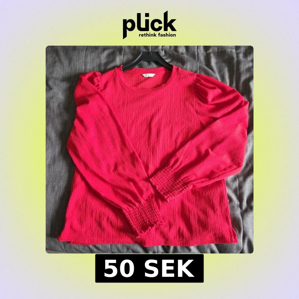 Säljer en snygg röd långärmad topp från Cubus i storlek XL. Tröjan har puffiga axlar och smockade muddar vid ärmsluten. Materialet är lätt strukturerat.