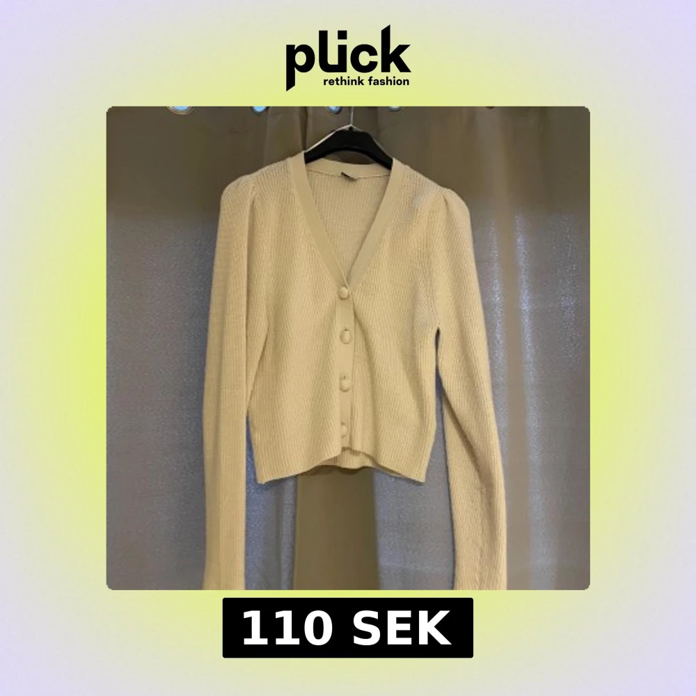 Säljer en beige ribbad kofta med v-ringning och stora knappar framtill. Tröjan har lång ärm och är lite croppad i modellen. Perfekt att slänga över en topp för en enkel men snygg look.