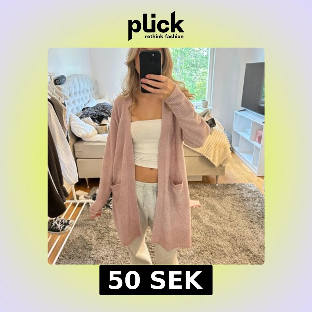 Supermysig ljusrosa lång kofta med två stora fickor framtill och ribbade muddar. Koftan har en relaxed passform och är perfekt att slänga över en topp för en chill look. Materialet känns mjukt och skönt mot huden.