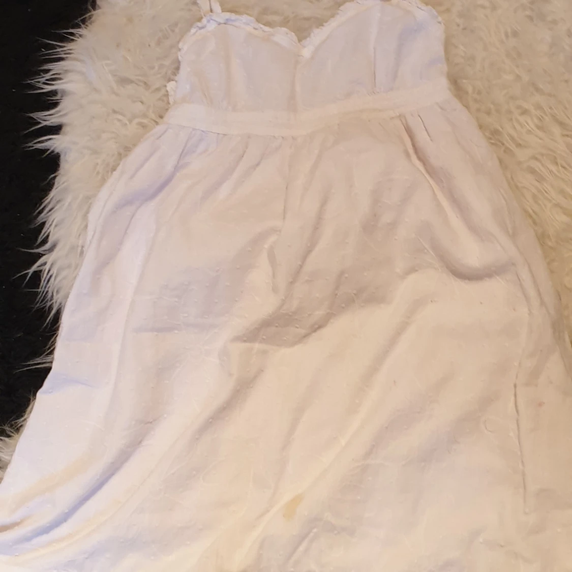 En fin vit klänning som har vita prickar bra skick en svart kjol som är i bra skick och en grå bacik kofta
