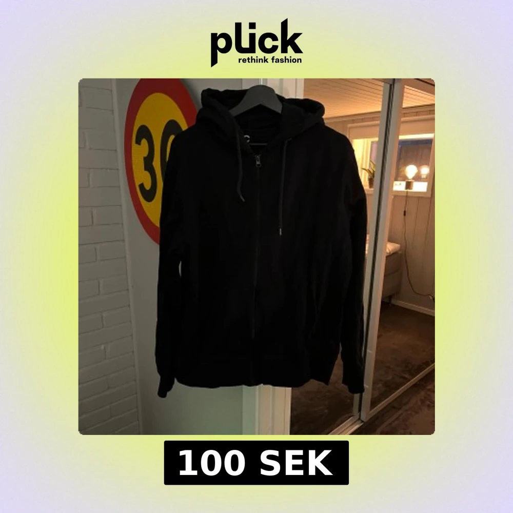Svart hoodie med huva och snörning, hel dragkedja framtill och långa ärmar. Perfekt för chill dagar och enkel att matcha med jeans eller joggers. Mjuk och skön känsla tack vare bomullsmaterialet. Det är en XL men känns som en L.