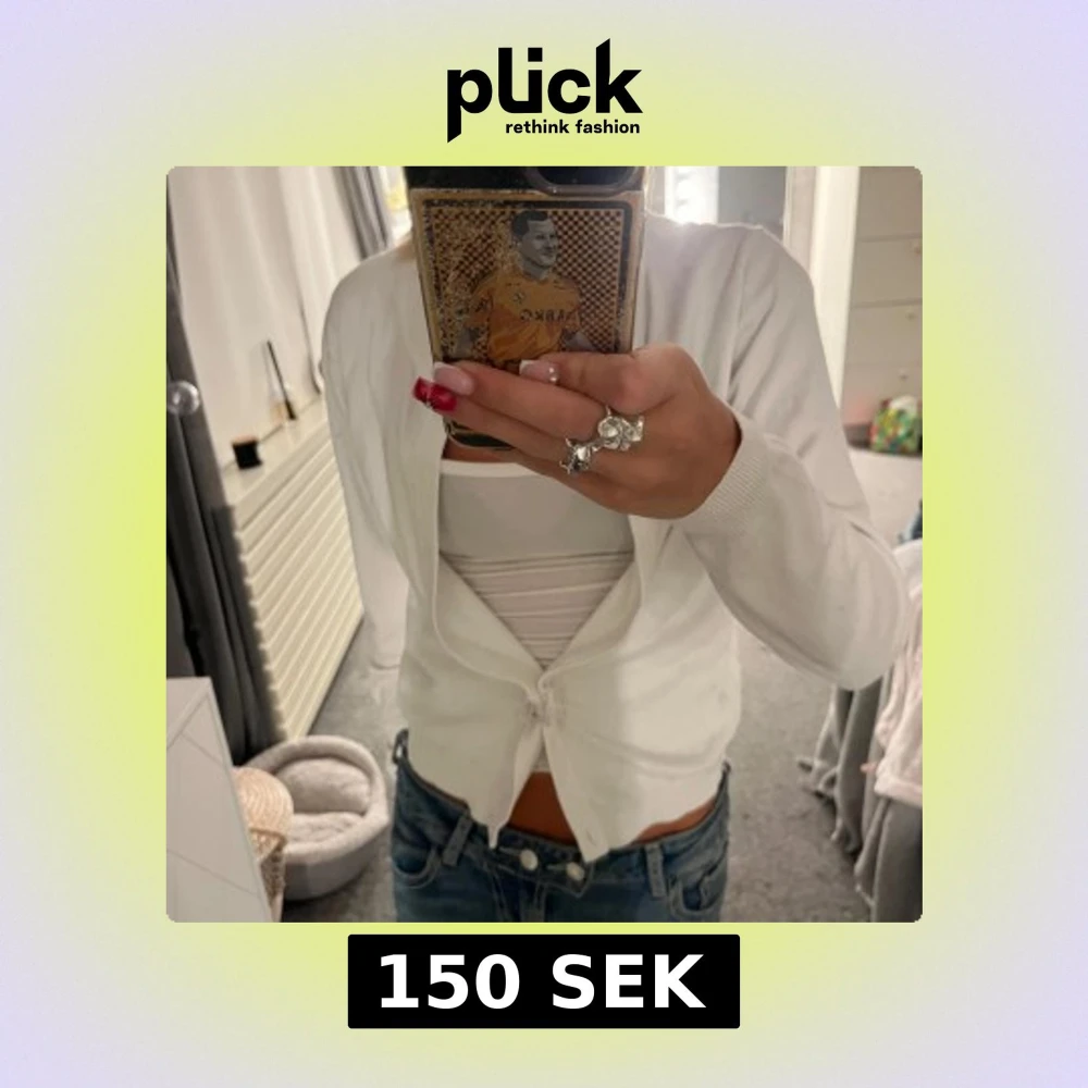 Säljer en söt vit kofta från C i storlek XS. Koftan har lång ärm, smal passform och knäpps framtill med en knapp. Perfekt att slänga över ett linne eller topp för en clean och fräsch look.