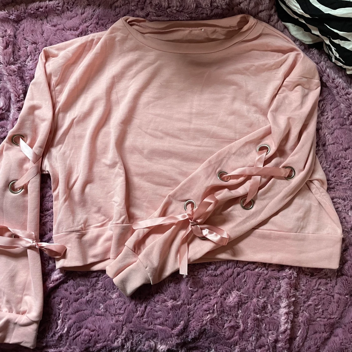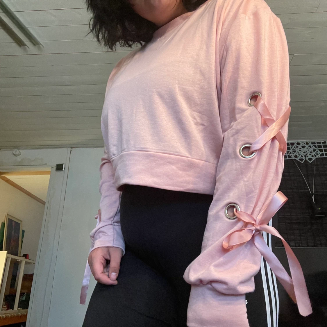 Rosa långärmad croptop med snördetaljer på ärmarna. (Slarvigt knutet på bilderna men går att göra om såklart) Köpt från shein i dec 2020. Använd 1 gång så är i nyskick. Storlek 1XL men passar även L. 💌 Frakt är baserad på frimärken. Önskas postnords blå påsar/kartonger löser vi givetvis det.