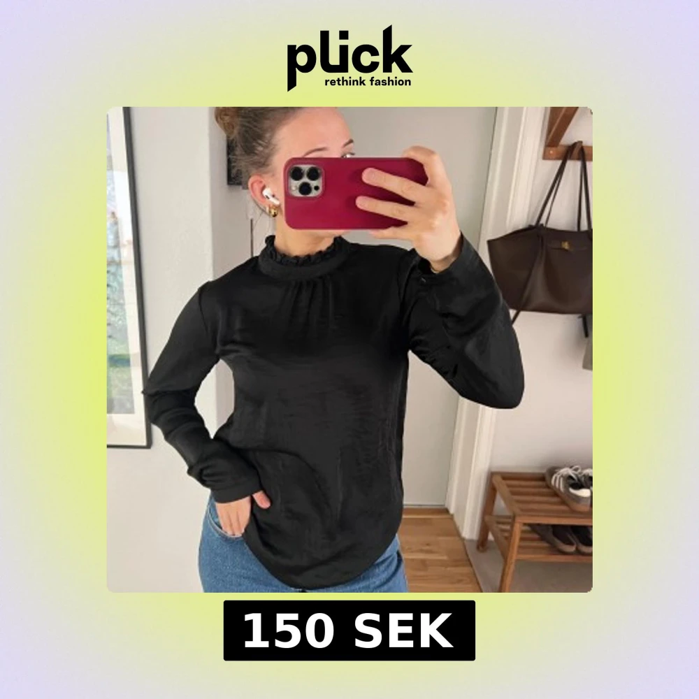 Säljer en svart blus från ICHI med lång ärm och volangdetalj vid kragen. Blusen har en lätt glansig yta och en rak passform, perfekt att styla till jeans eller kjol. Klassisk och stilren modell med diskreta detaljer.