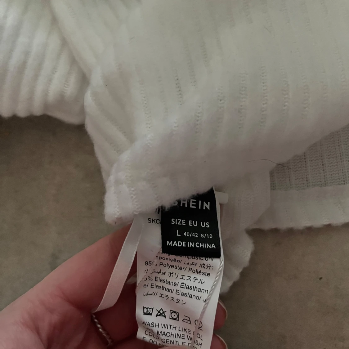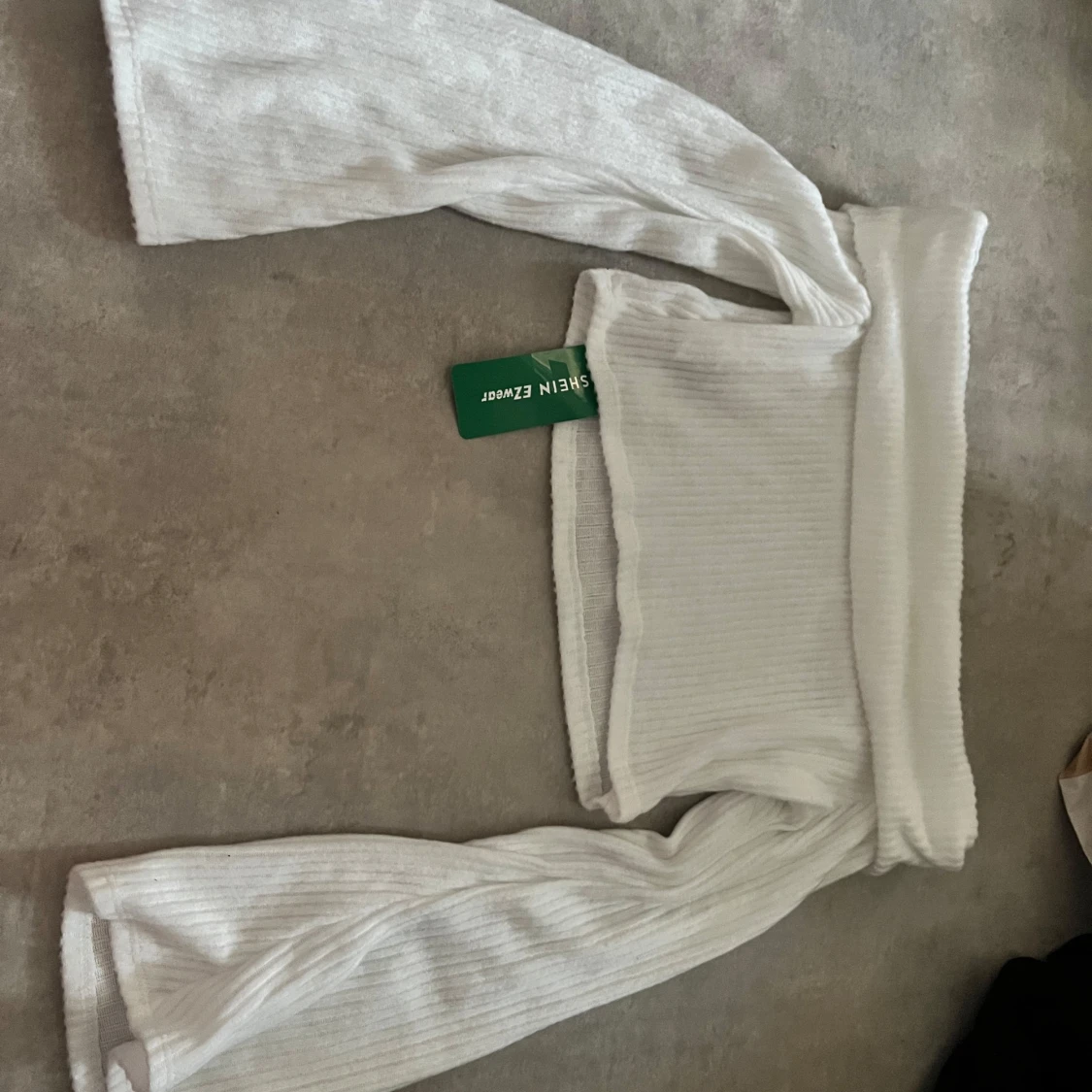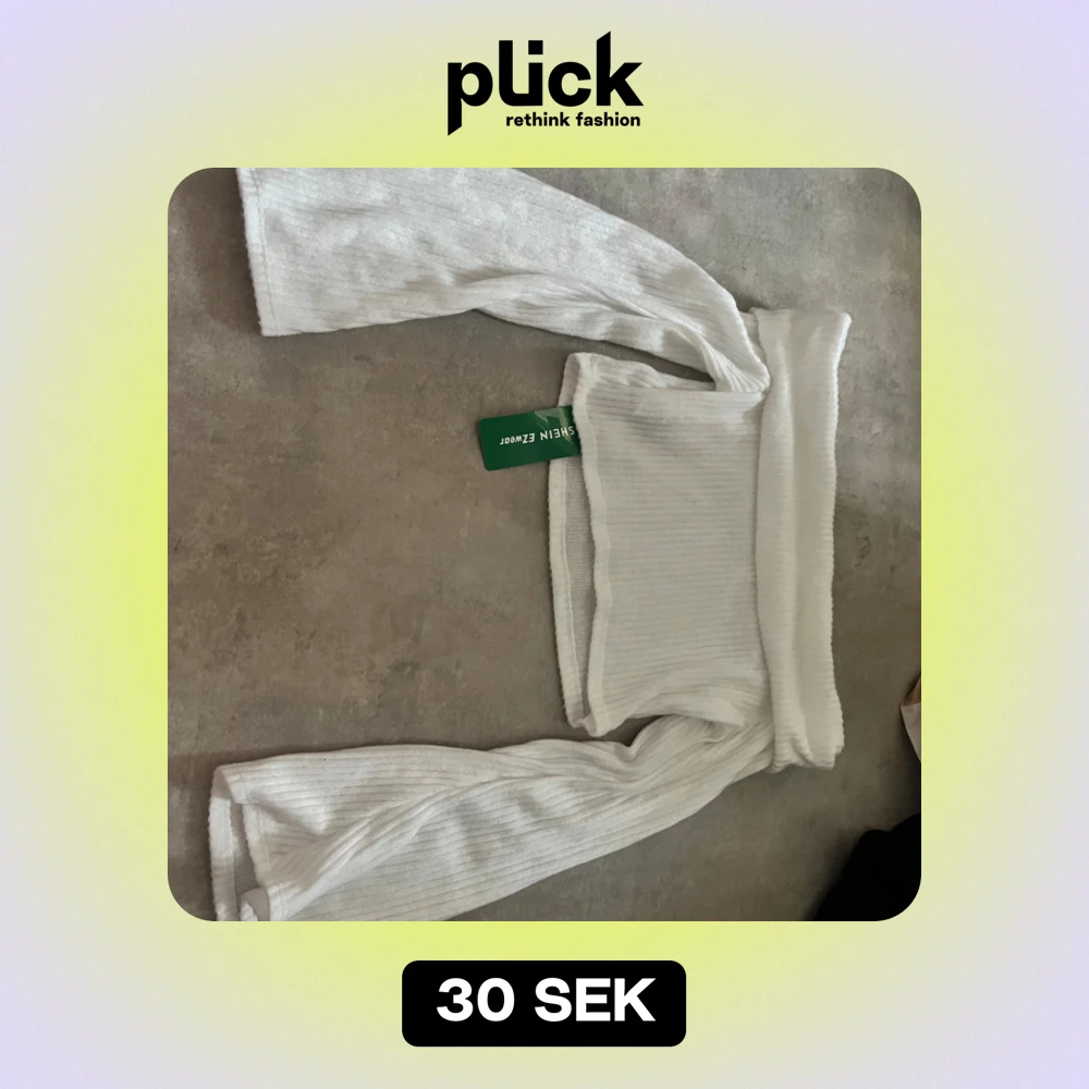 Säljer en superfin vit ribbad tröja från Shein. Den är i storlek L och har långa ärmar samt croppad. Helt ny och oanvänd!
