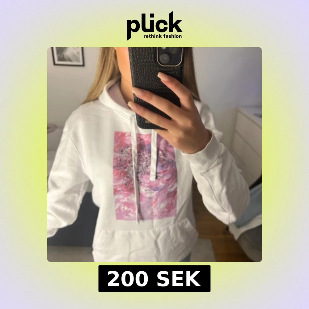 Vit hoodie med huva och dragsko, framtill ett stort tryck i rosa och lila toner. Liten svart logga på ryggen. Perfekt för en avslappnad stil.