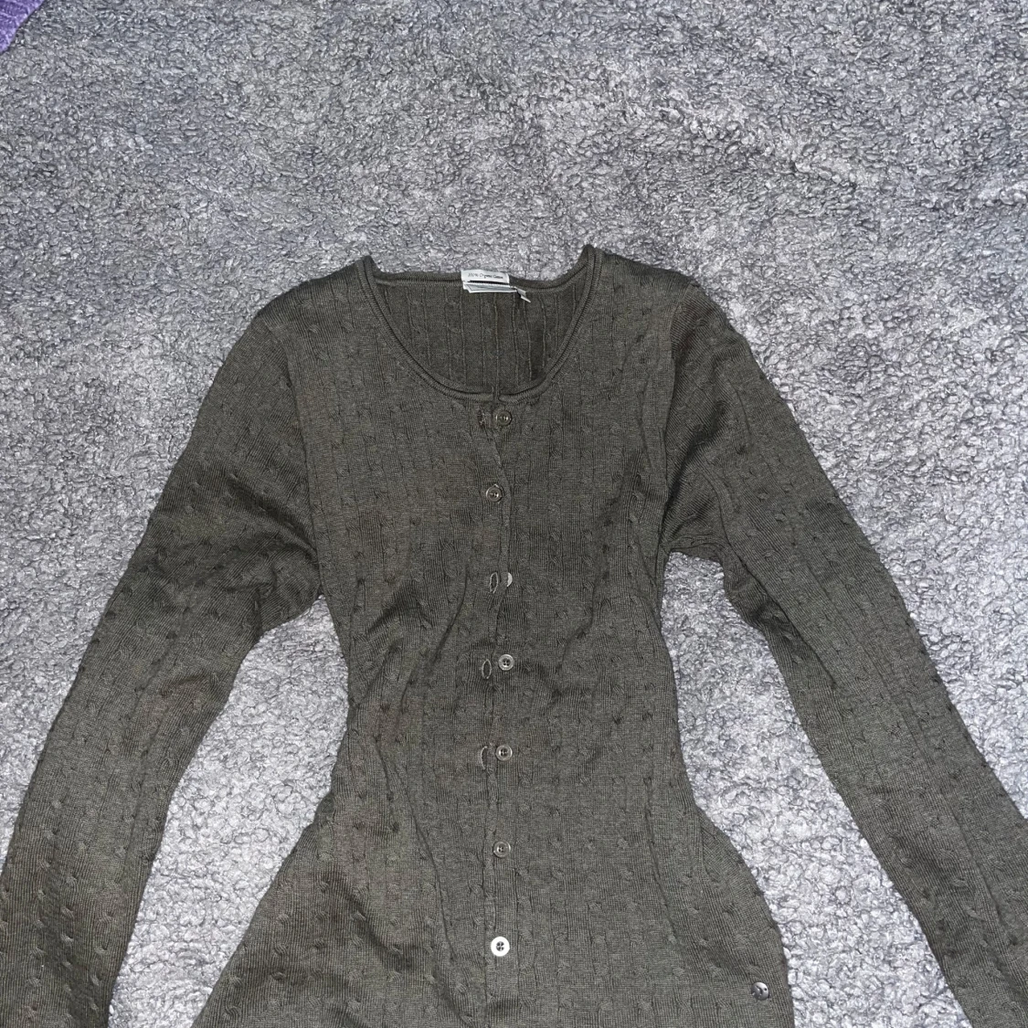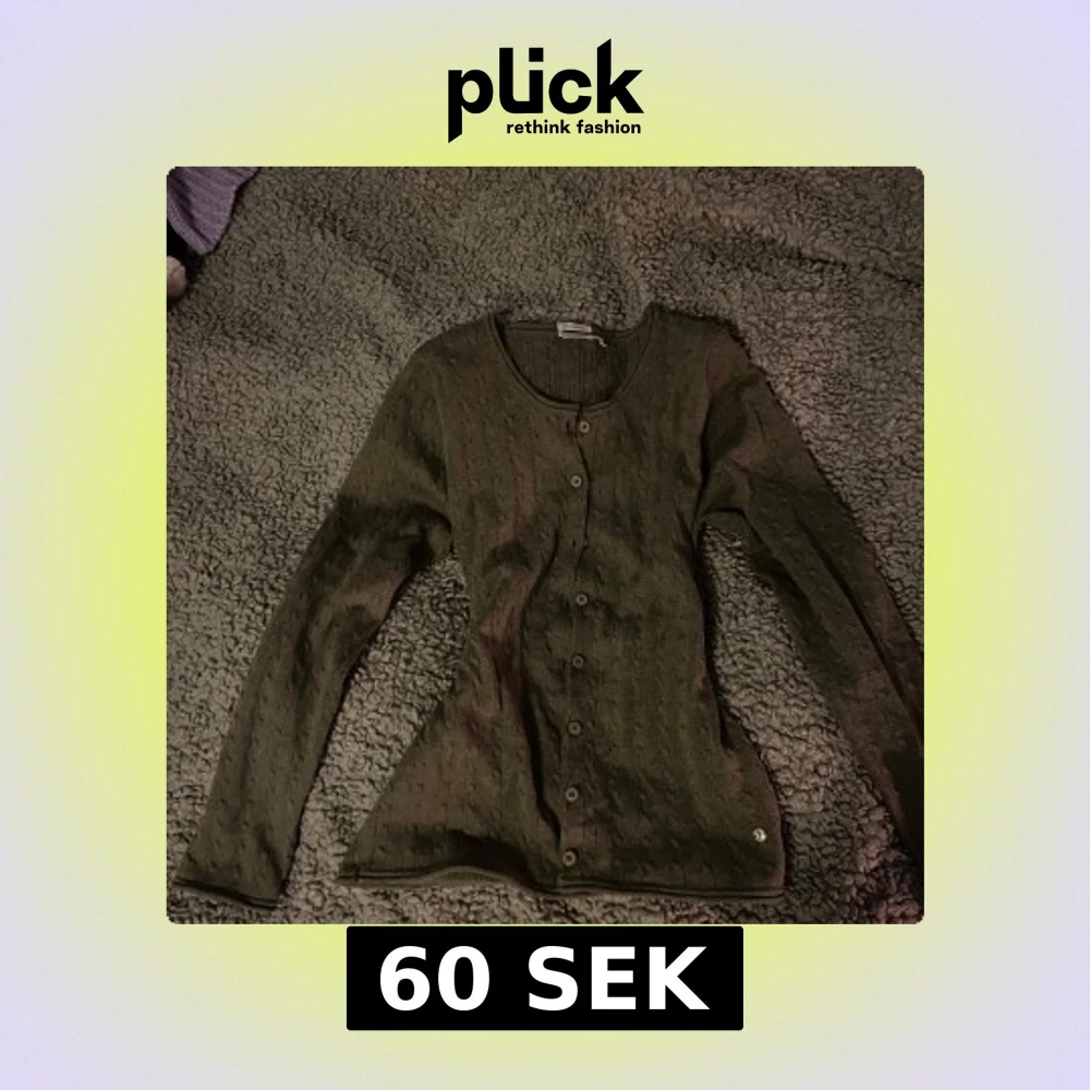 Säljer en stilren grön kofta med knappar framtill. Den har en rund halsringning och långa ärmar, perfekt för lager på lager-stil. Passar bra till både vardag och mer uppklädda tillfällen.