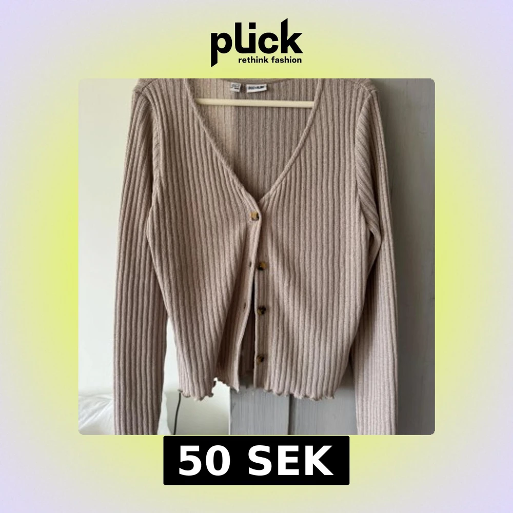 Säljer en beige ribbad kofta från Bodyflirt med v-ringning och knappar framtill. Koftan har långa ärmar och en croppad, vågig nederkant.