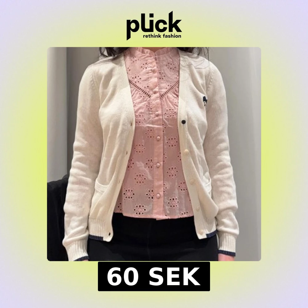 Söt Teenie Weenie-kofta i krämvitt, stl M (165/88A) Charmig och mjuk kofta i preppy stil med broderad björnlogga. V-ringning och knäppning fram, passar perfekt till vardag eller skola. I mycket gott skick. Material: 82,6 % bomull, 17,4 % akryl. Mått: axel 36 cm, ärm 64 cm, längd 62 cm. Hämtas i Kista eller skickas.