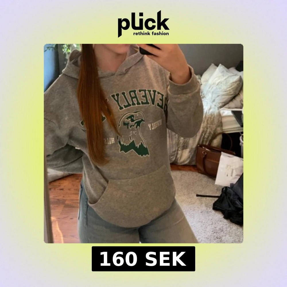 Säljer en grå hoodie med grönt och vitt tryck från Beverly. Tröjan har huva och en stor magficka framtill. Perfekt för en avslappnad stil och passar till jeans eller leggings.