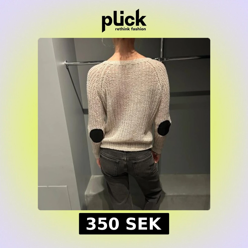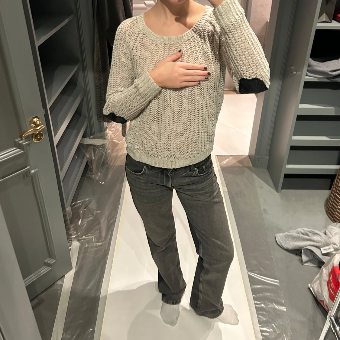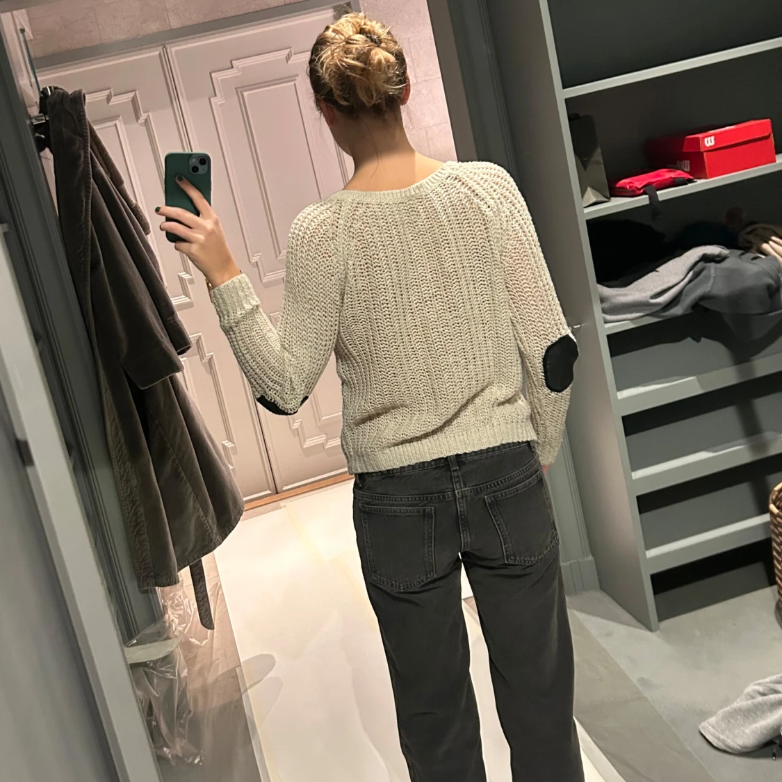 Säljer en beige stickad tröja med svarta armbågslappar. Tröjan har en avslappnad passform och långa ärmar, perfekt för kyligare dagar. Den är både stilren och bekväm, ett måste i garderoben!