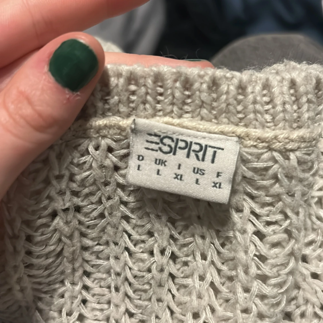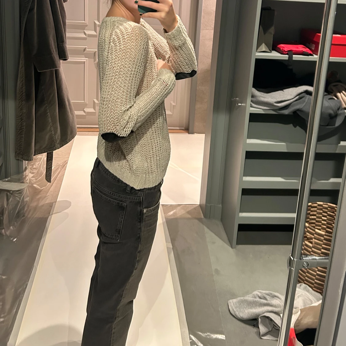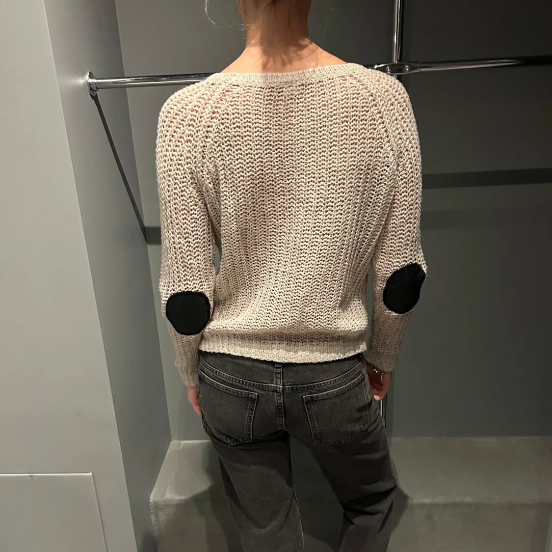 Säljer en beige stickad tröja med svarta armbågslappar. Tröjan har en avslappnad passform och långa ärmar, perfekt för kyligare dagar. Den är både stilren och bekväm, ett måste i garderoben!
