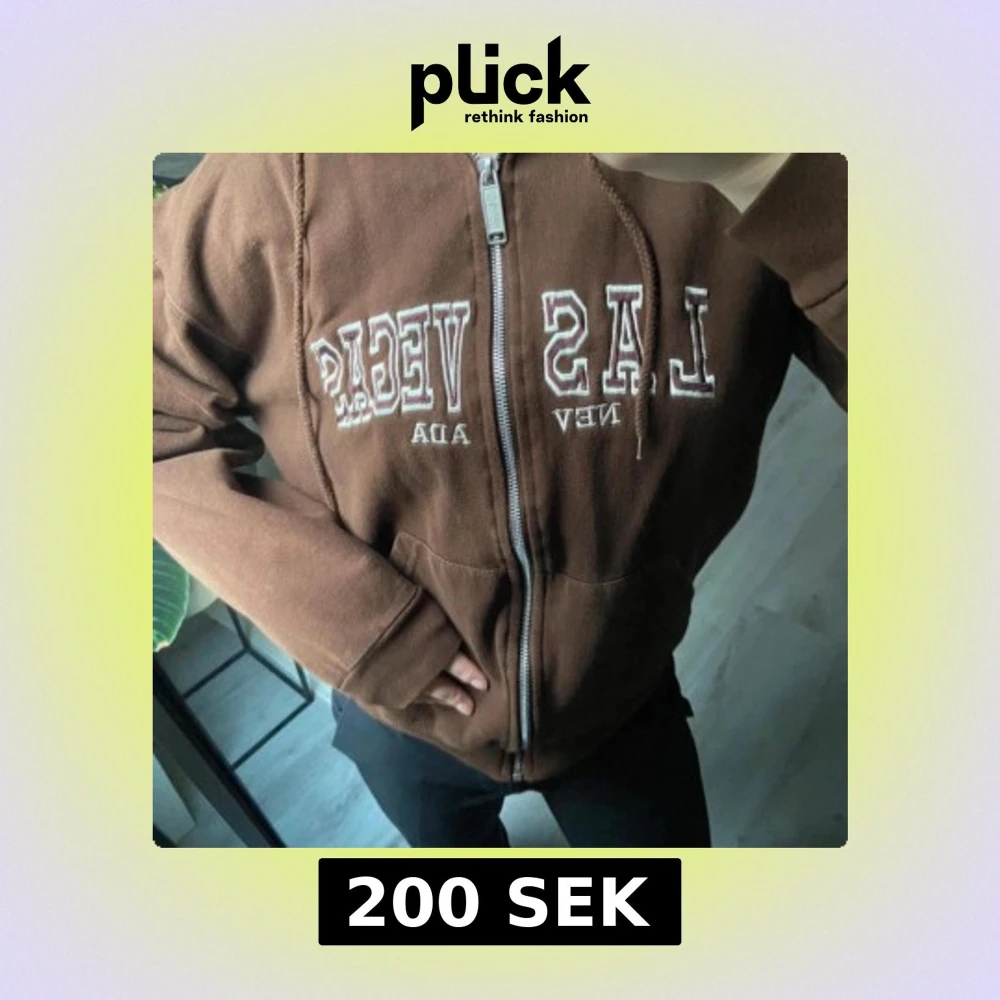 Säljer en brun hoodie med dragkedja och Las Vegas-tryck på framsidan. Den har en mysig huva och långa ärmar.
