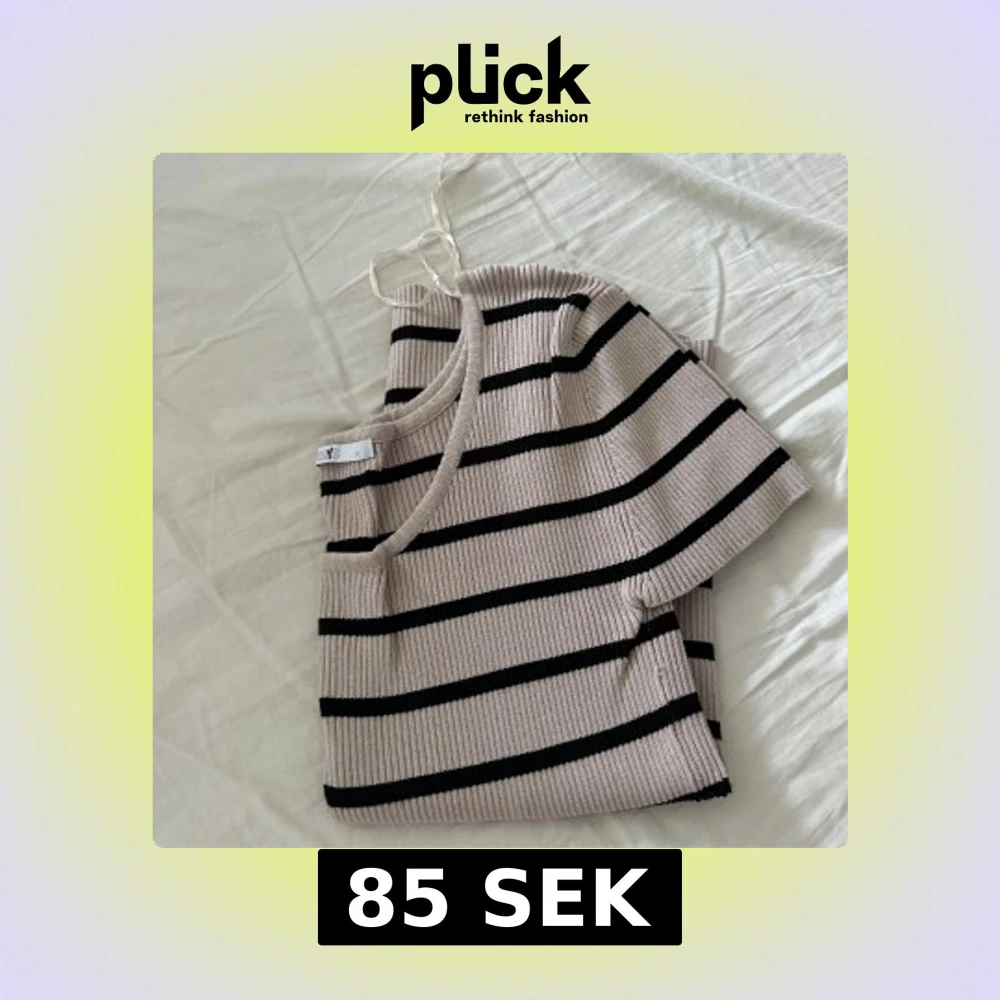 Säljer en snygg beige topp med svarta ränder. Den är ribbad och har korta ärmar, perfekt för en stilren look. Toppen har en rund halsringning och är i ett mjukt material.