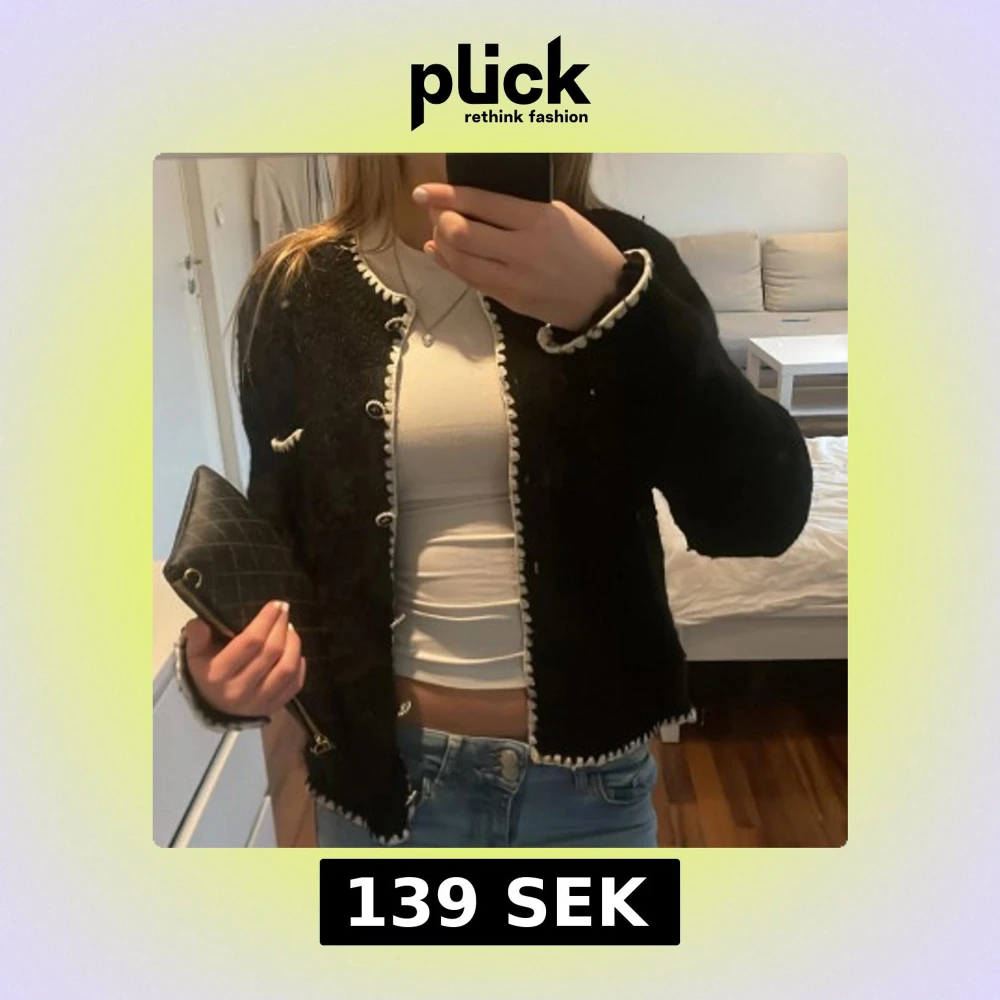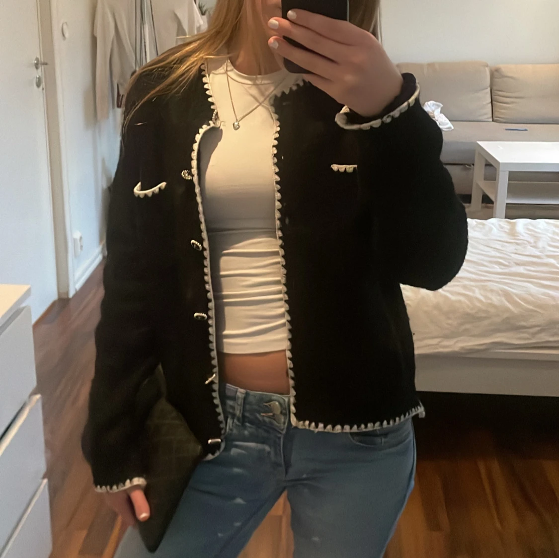 Snygg svart cardigan jacka från CC-company med vita detaljer och knappar. Jackan har en klassisk design med långärmade ärmar och en normal passform. Perfekt för att ge en stilren touch till din outfit. Nypris 499kr, säljer för 139kr.