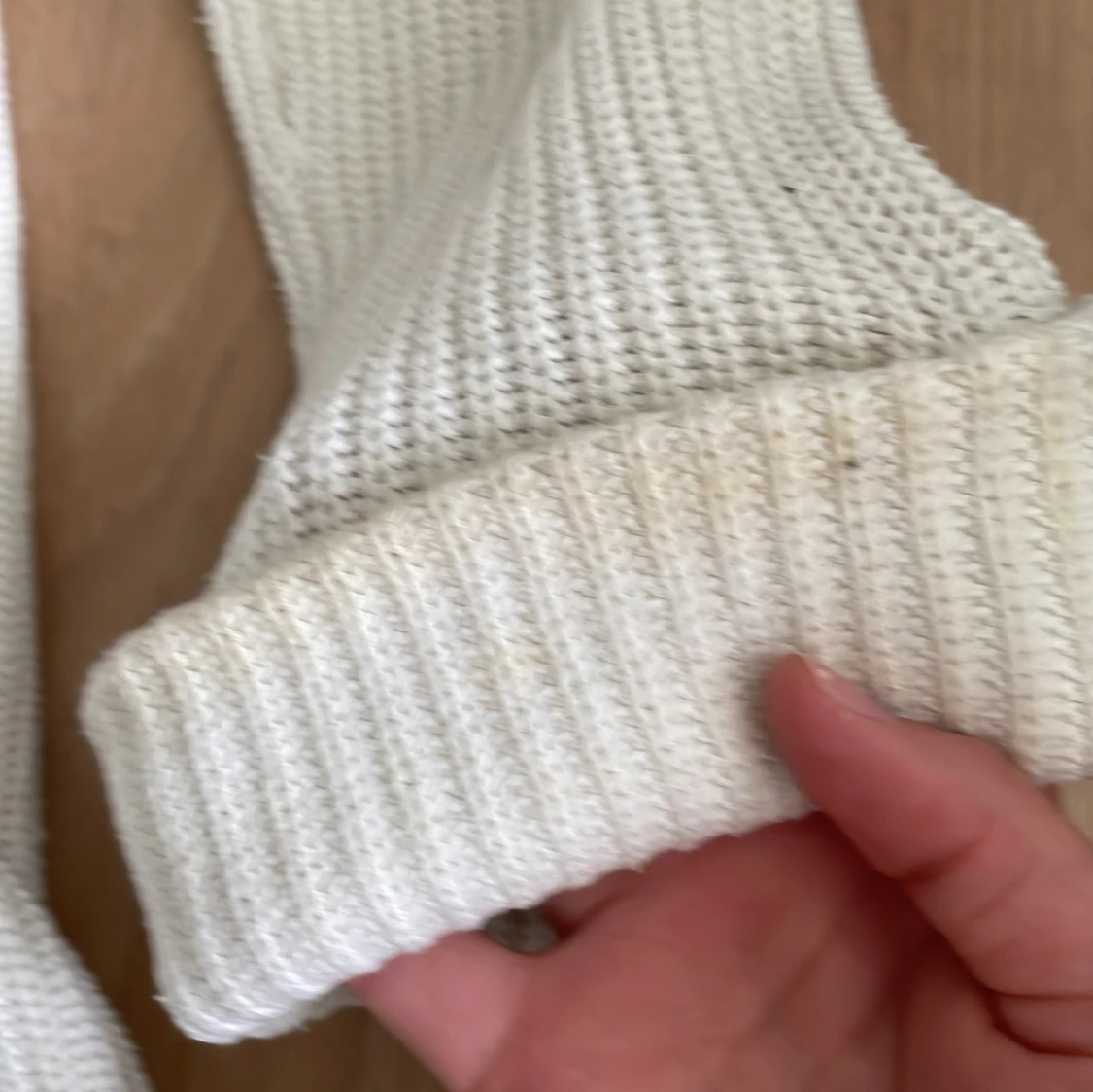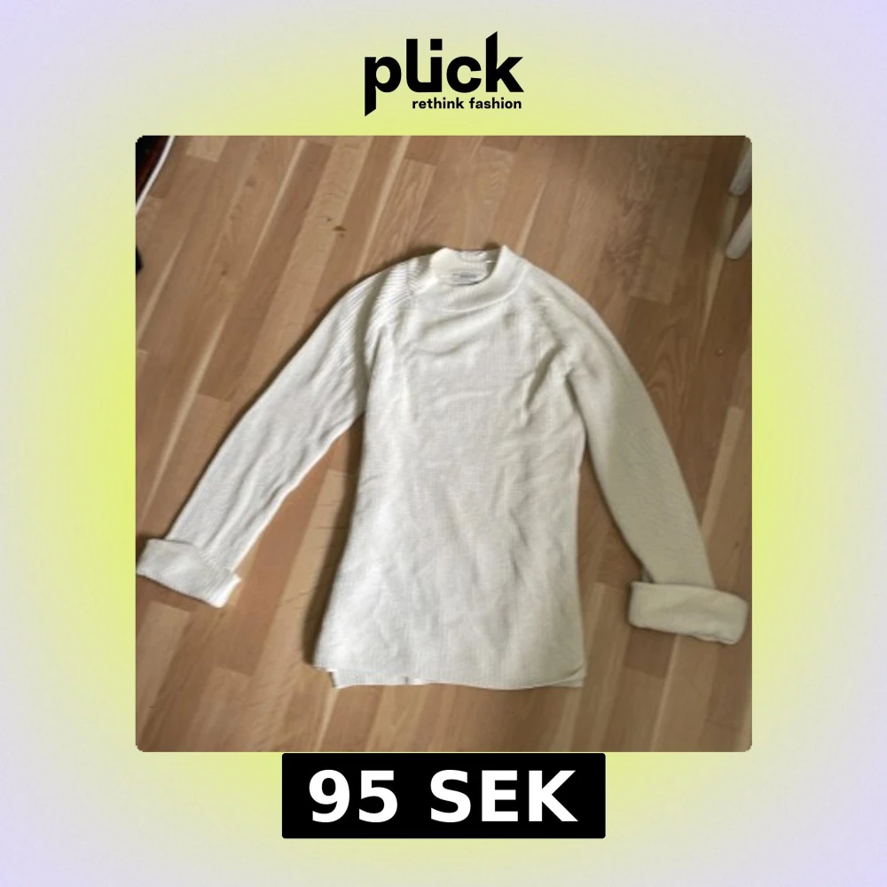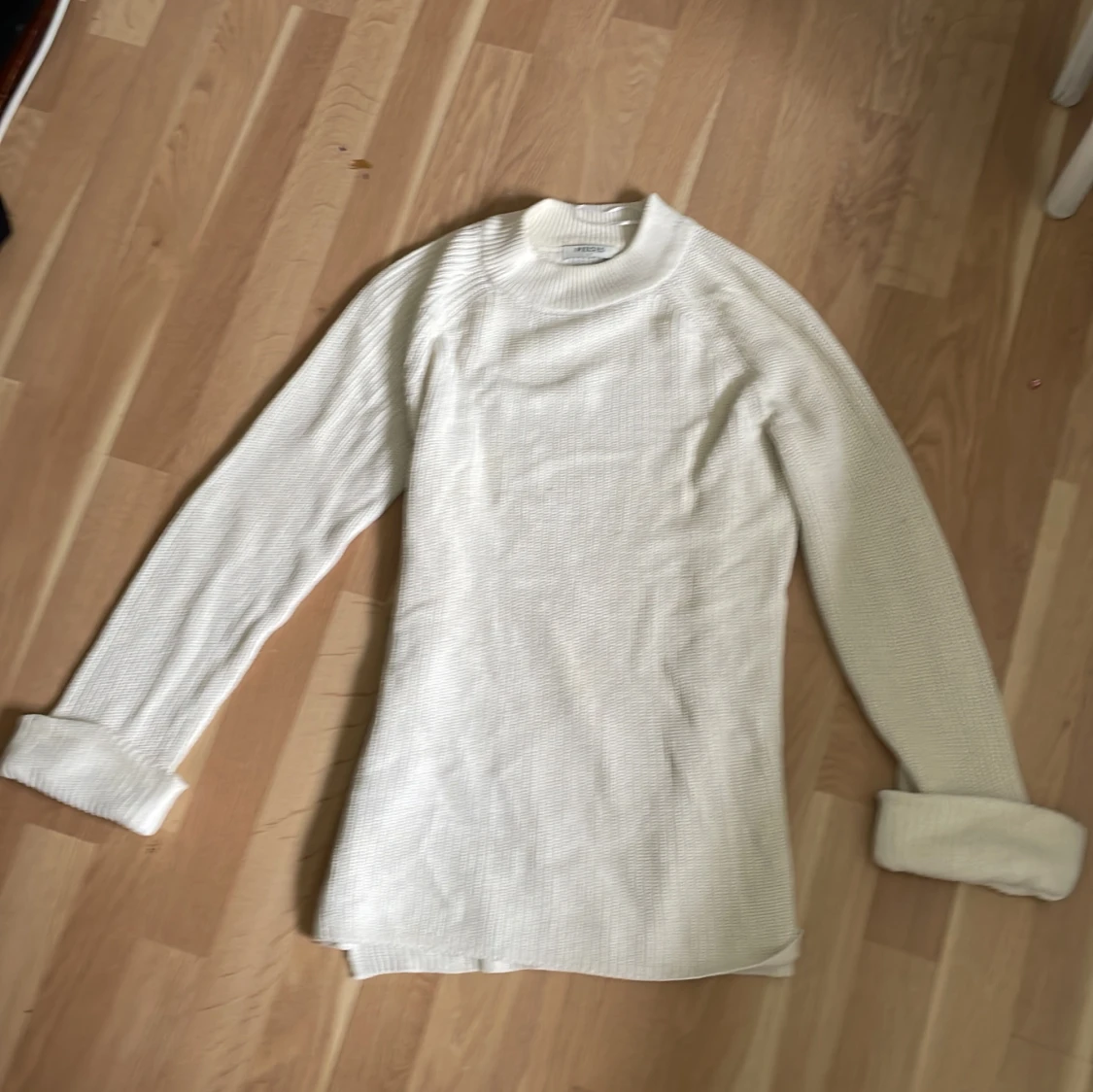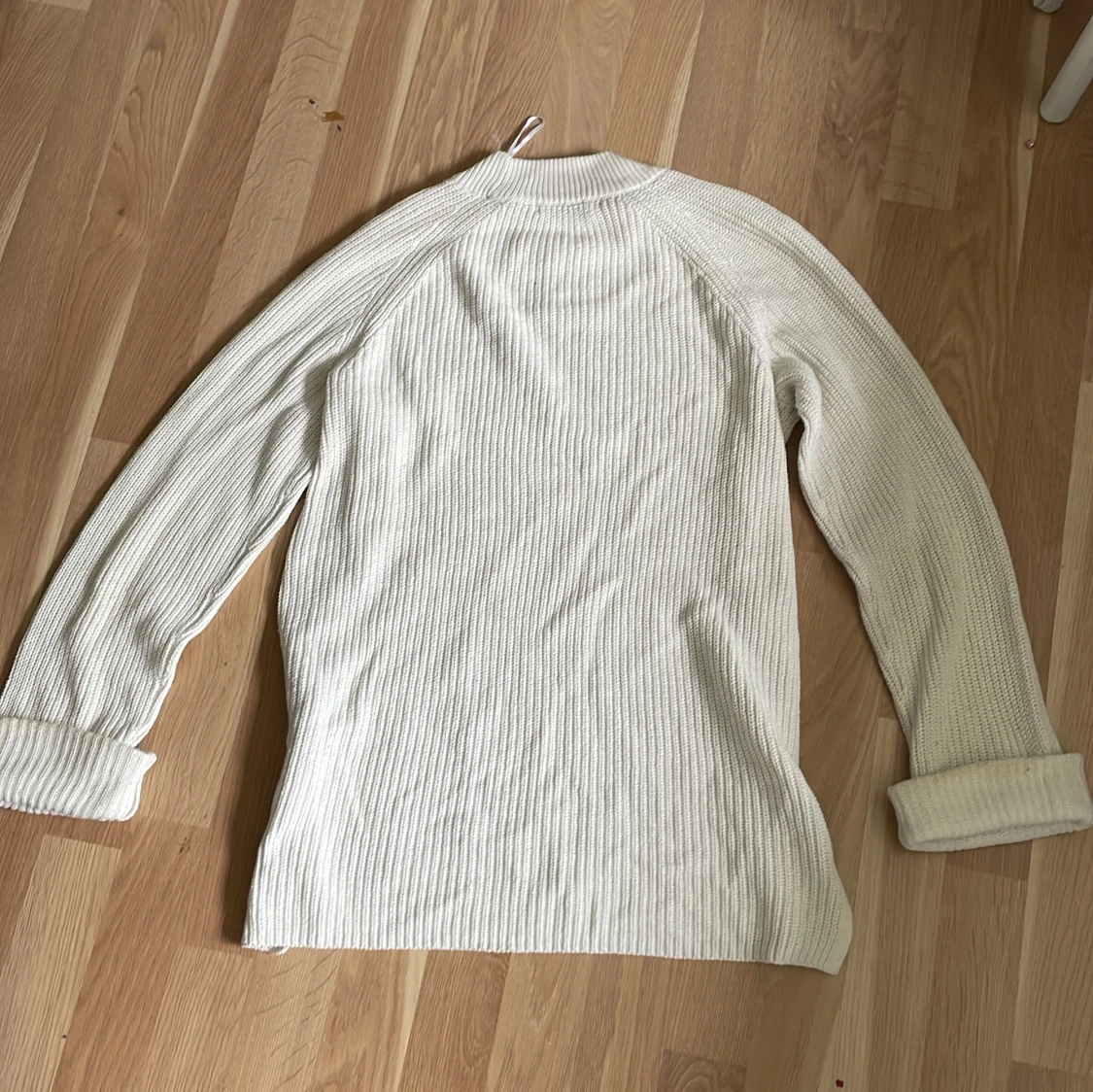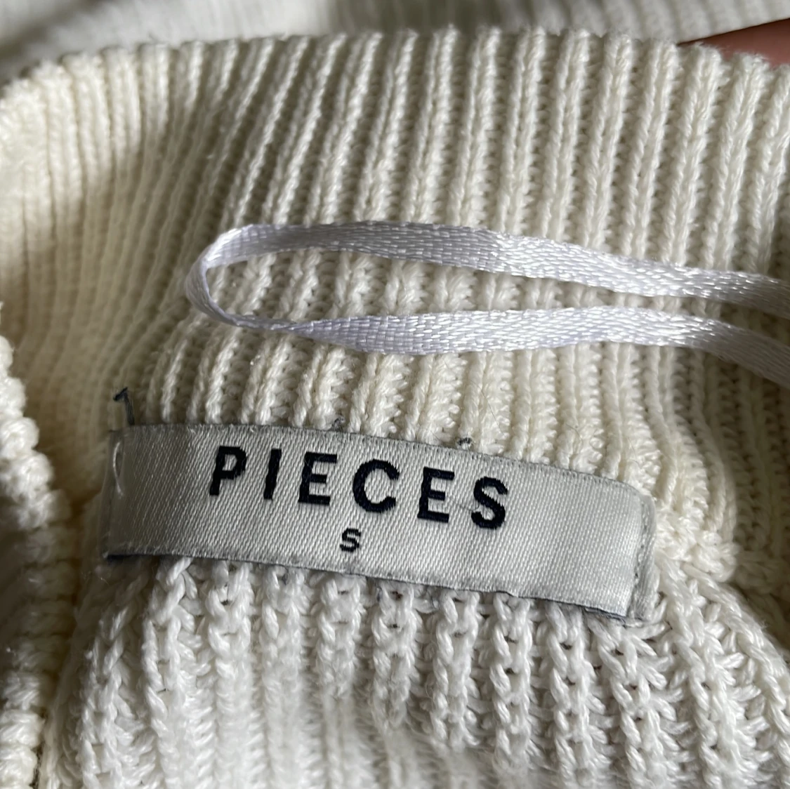 Säljer en vit stickad polotröja från Pieces i storlek S. Tröjan har lång ärm med uppvikta muddar och är ribbstickad för en snygg struktur. Perfekt för lager-på-lager och enkel att matcha med olika outfits.