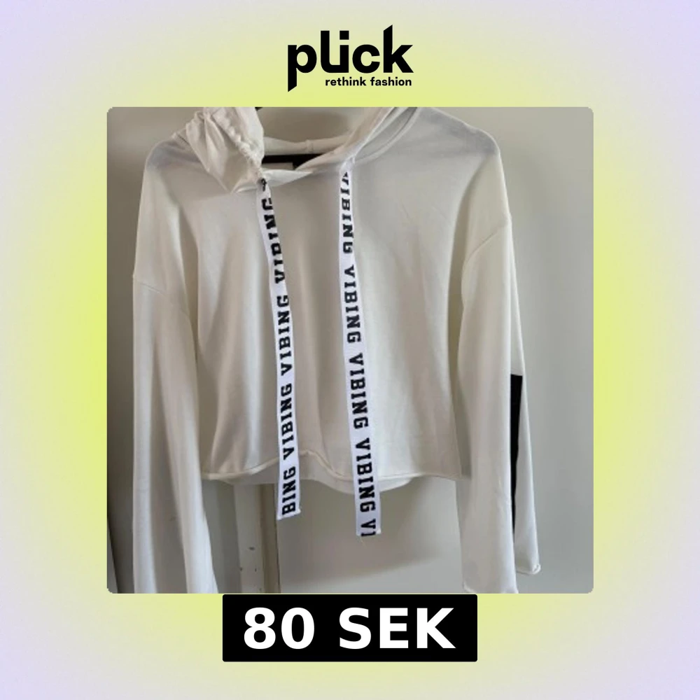 Säljer en vit hoodie med svarta snören där det står 'VIBING' i vitt. Tröjan är croppad och har huva samt lång ärm med stort tryck på ena ärmen. Perfekt för en avslappnad stil. Använd en gång så jätte bra skick!