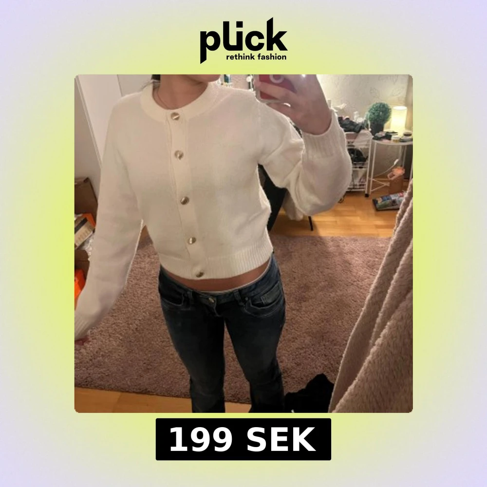 Vit kofta med guld knappar från H&M i storlek S. Den är helt oanvänd. Säljer på grund av att den inte kommer till någon användning. Men verkligen super fin! Köpt för 299kr.
