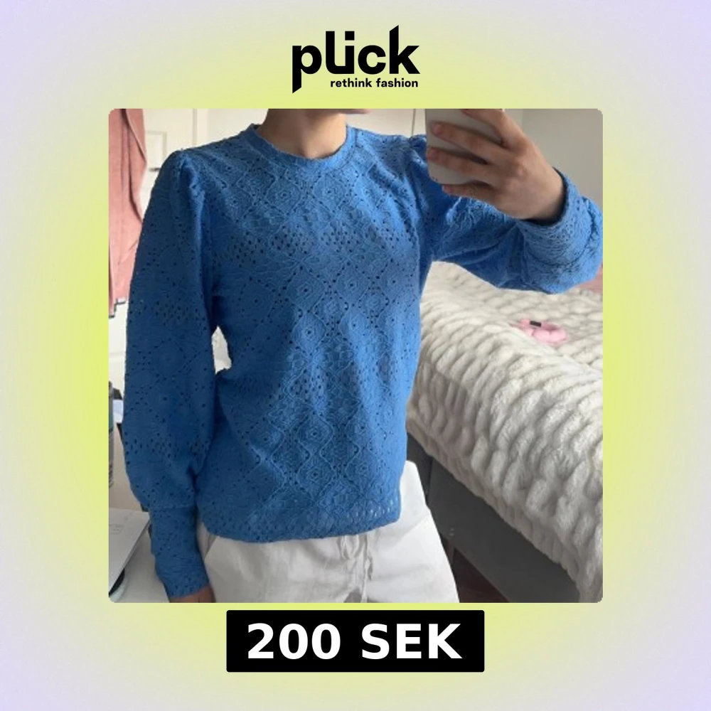 Säljer en blå blus med långa ärmar från Object med rund halsringning. Blusen har ett genomgående spetsmönster med fina detaljer och lätt puffade axlar. Perfekt sommarblus och känns helt oanvänd🥰