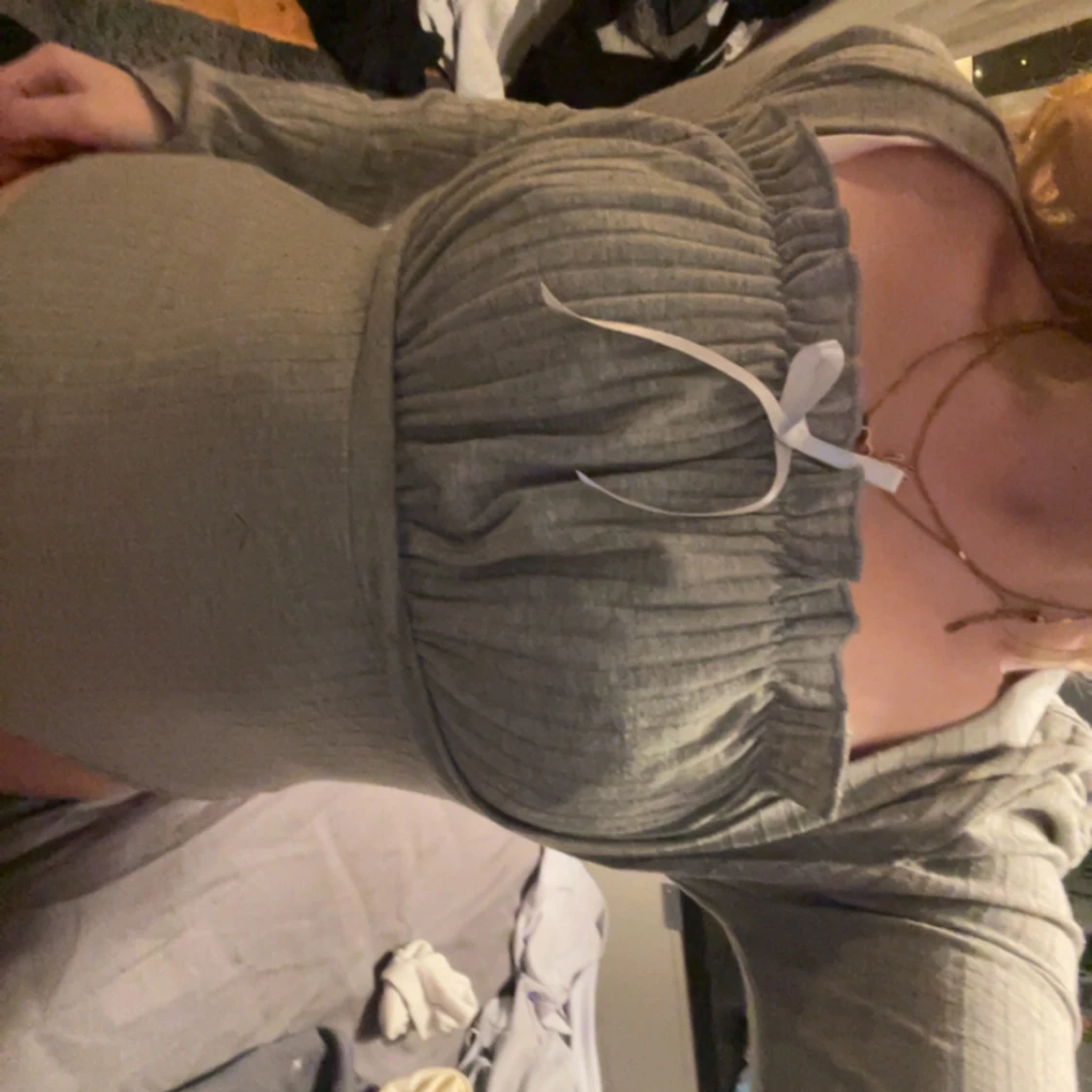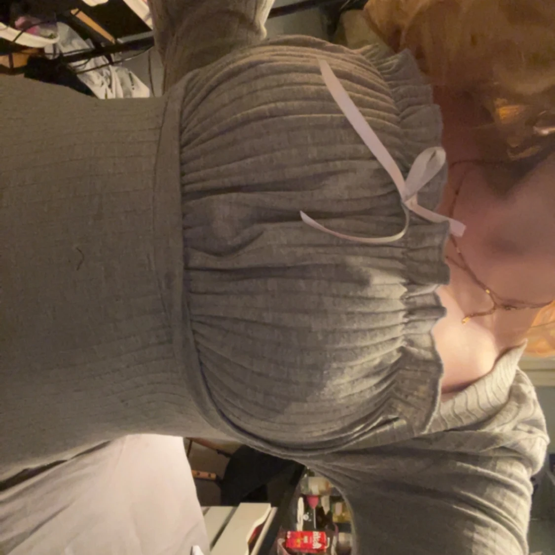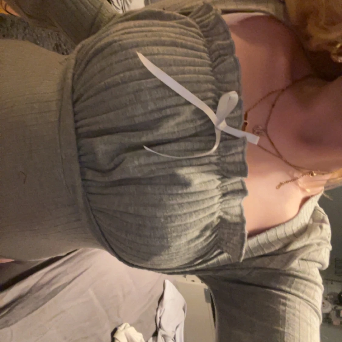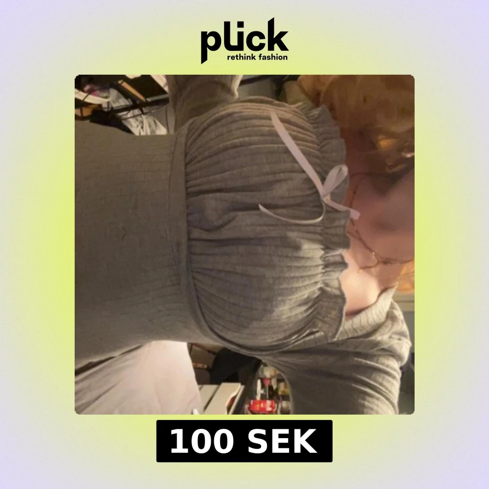 Säljer en stilren grå ribbad topp med långa ärmar och ett sött knytband framtill. Perfekt för en avslappnad look.