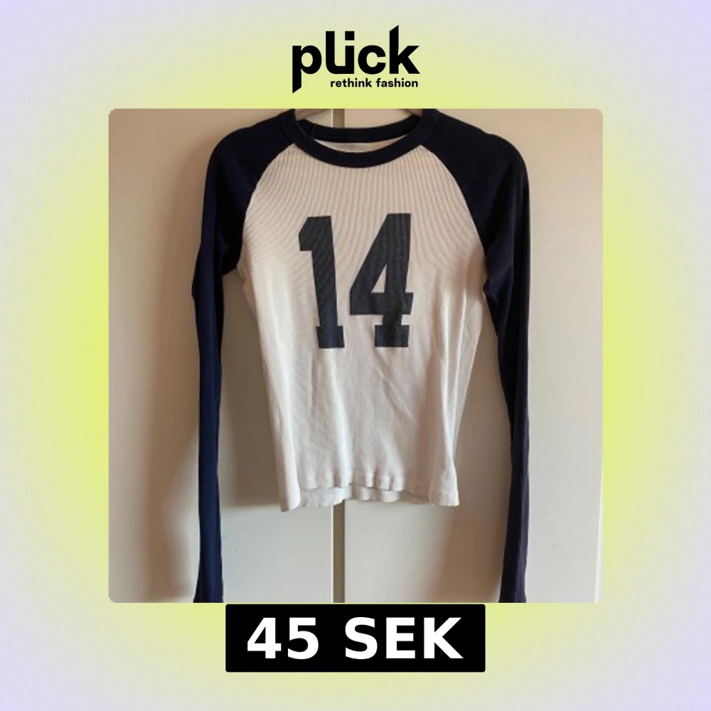 Säljer en ribbad långärmad tröja från John Galt i vit med marinblå ärmar och stort tryck med siffran 14 på bröstet. Tröjan är i 100% bomull och har en sportig, tight passform. Perfekt för en avslappnad och cool stil.