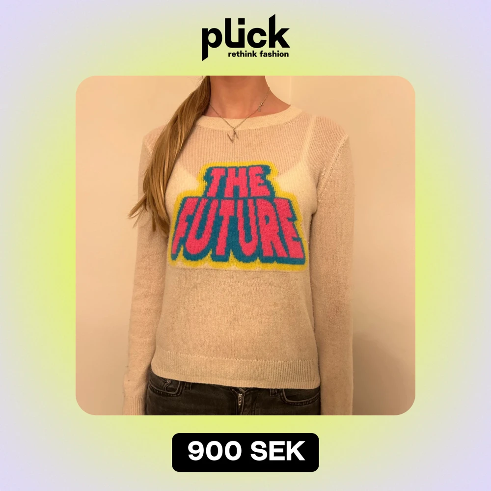 Säljer en 100% Kashmir tröja med ett coolt 'The Future' tryck i rosa, blått och gult. Tröjan är långärmad och perfekt för en avslappnad stil. Den är i bra skick och passar perfekt till jeans eller kjol. Perfekt för höst och vår! Köptes för 1900 säljer för 900kr
